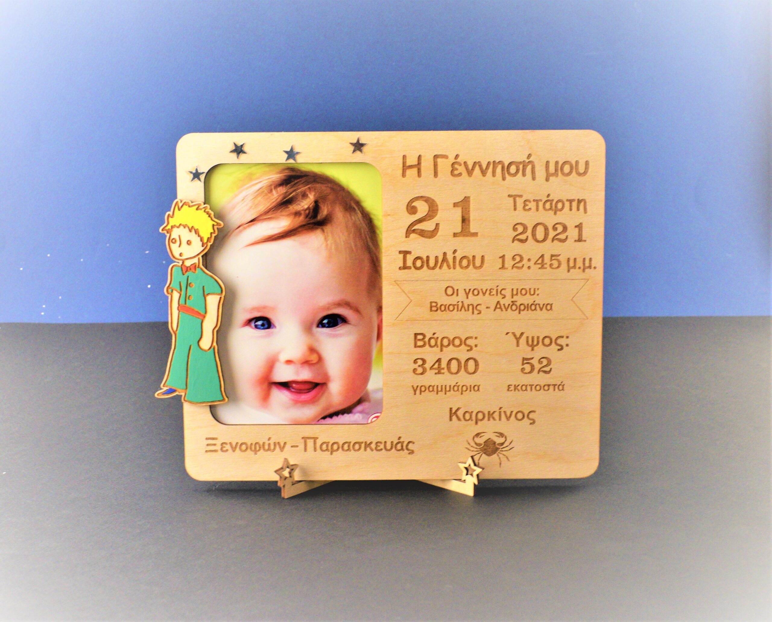 Δημιουργήστε το δικό σας αναμνηστικό γέννησης χαραγμένο με τα στοιχεία για το μικρό σας “θαυματάκι”, σε ξύλινη κορνίζα με πλαίσιο που ανοιγοκλείνει για να τοποθετήσετε την φωτογραφία του μωρού σας και την φιγούρα της αρεσκείας σας. Ιδανικό για διακόσμηση παιδικού δωματίου ή για δώρο σε νέους γονείς ή ακόμα και δώρο σε βαπτίσεις.
