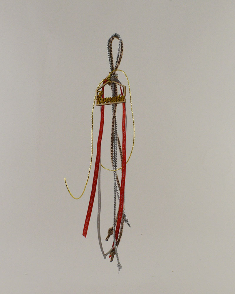 Κρεμαστό γούρι με χρυσό και χάλκινο σχοινί, κόκκινη κορδέλα και ξύλινο στοιχείο ”Ευτυχία”