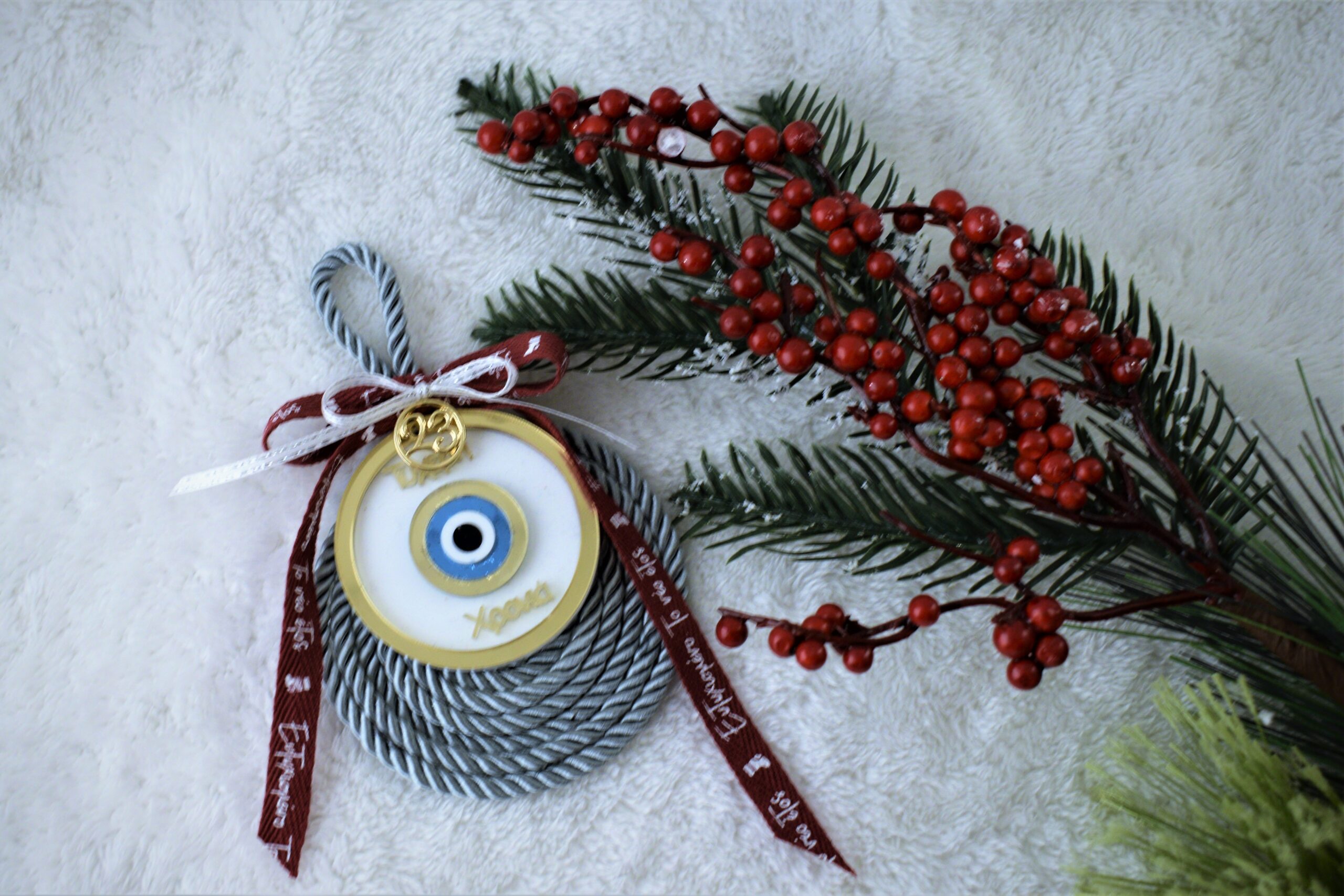 Χειροποίητο κρεμαστό γούρι με σχοινί πάχους 3mm με ιδιαίτερο δέσιμο σε ασημί χρώμα και μπορντό κορδέλα με ευχές. Επίσης αποτελείται από τρισδιάστατο στοιχείο plexiglass μάτι με την ευχή “τυχερή χρονιά”.