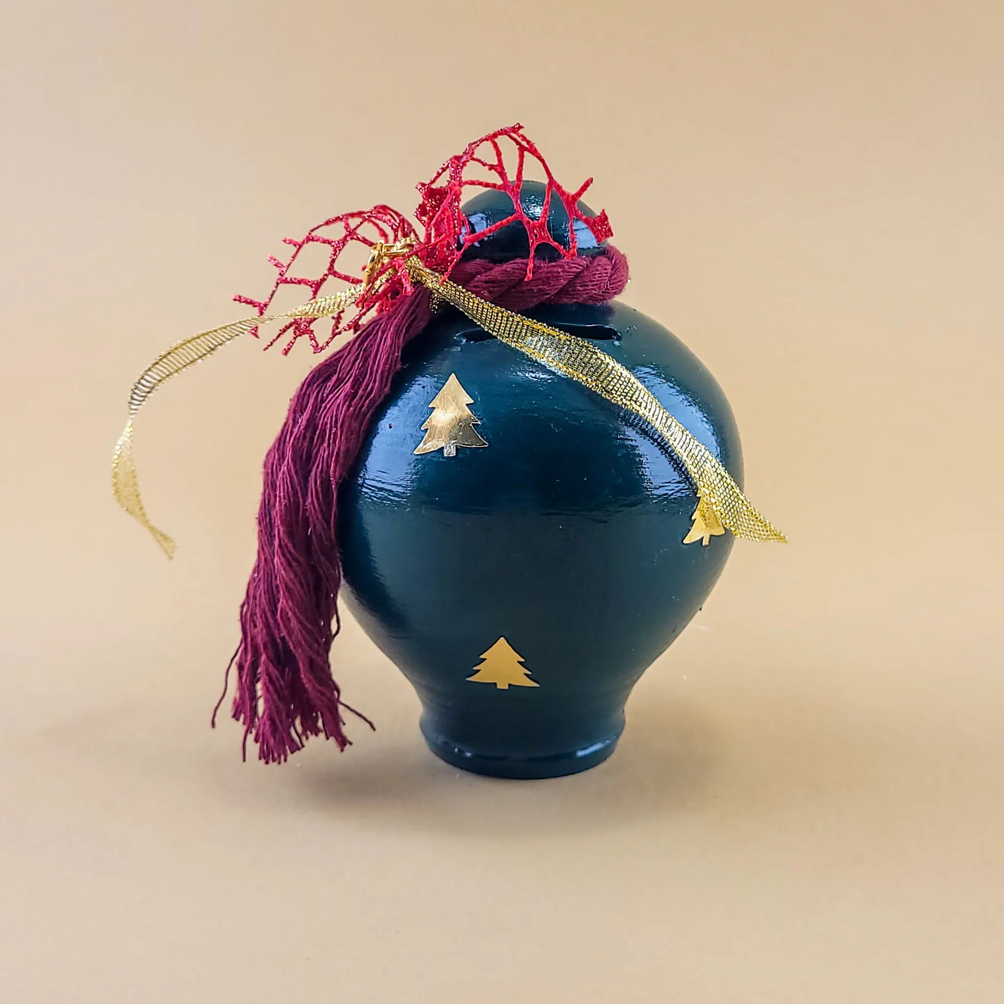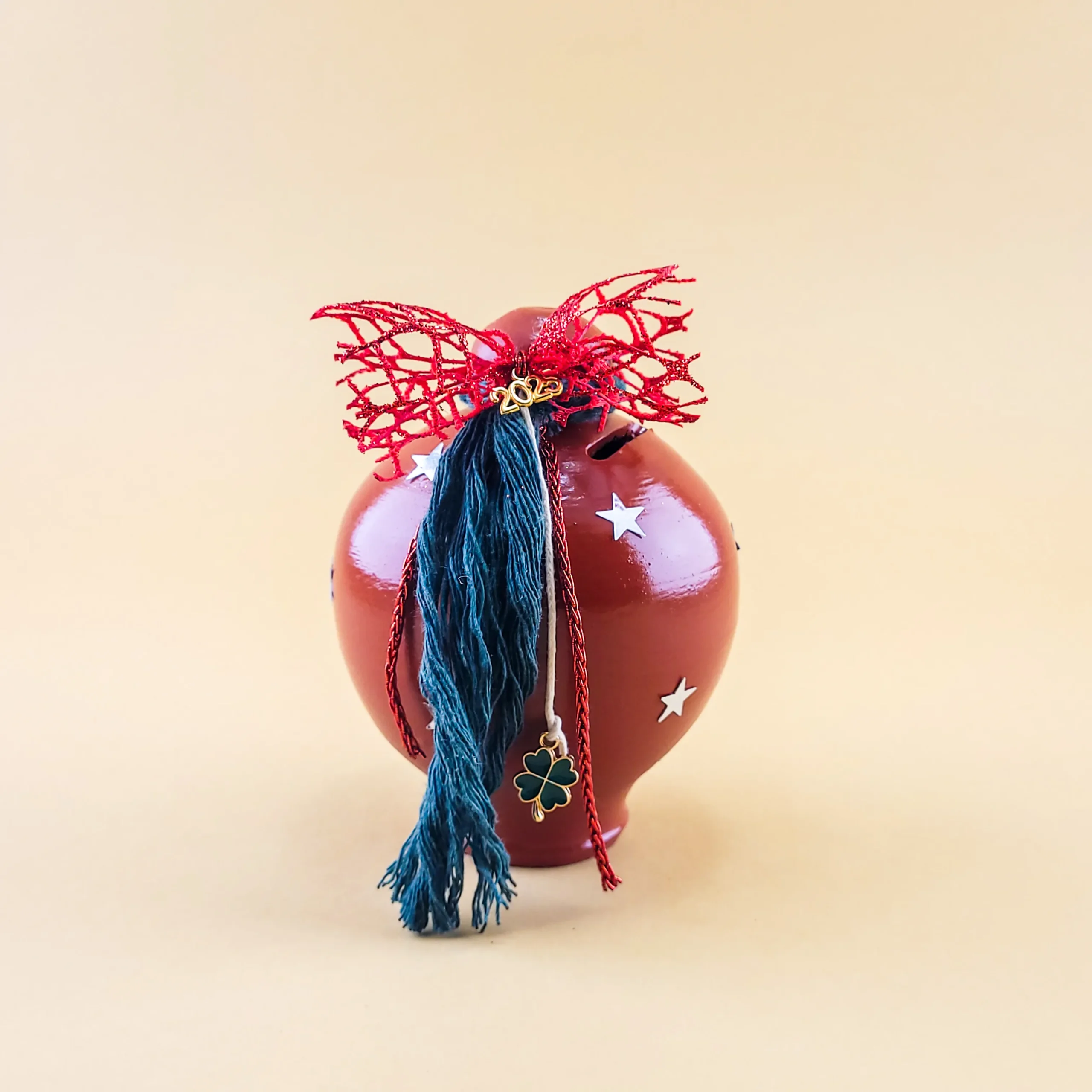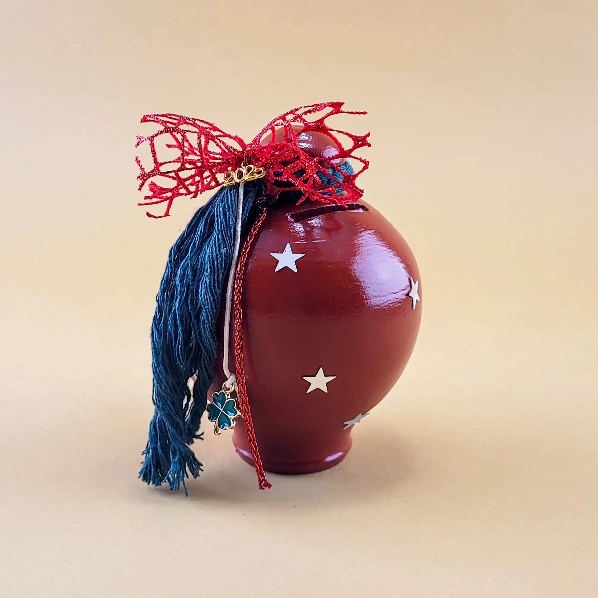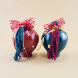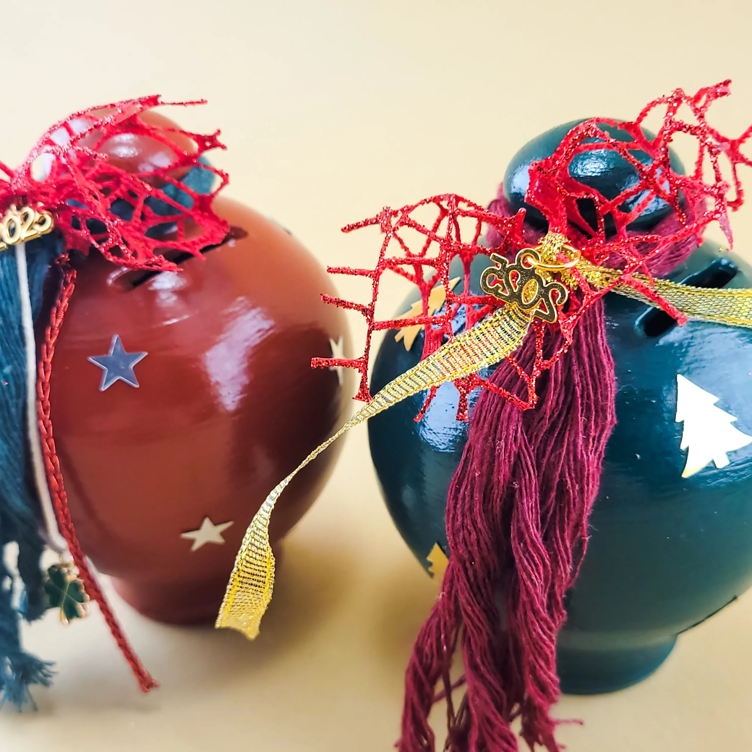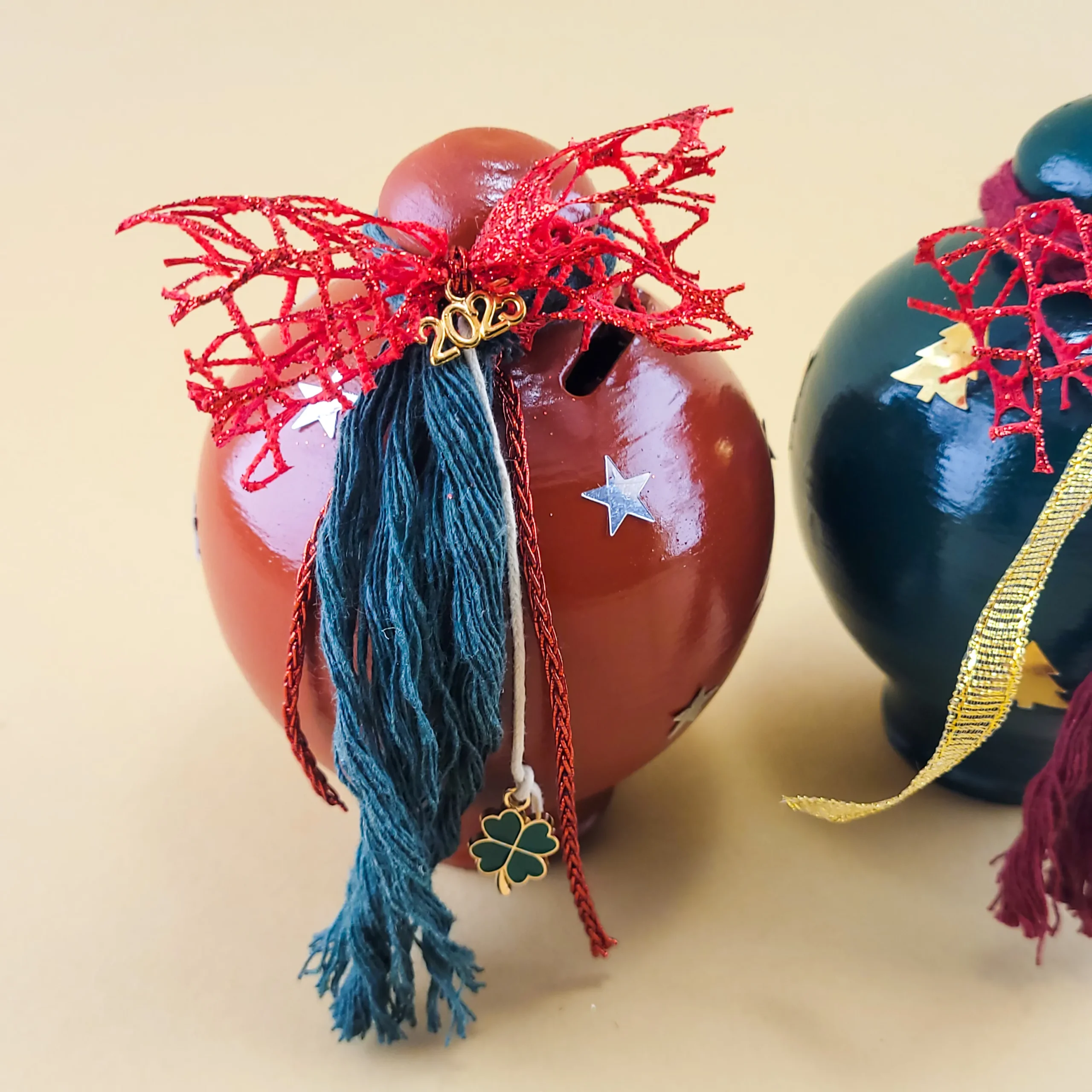 Αυτοί οι χειροποίητοι κεραμικοί mini κουμπαράδες διατίθενται σε κόκκινο και πράσινο χρώμα και διαθέτουν γιορτινές λεπτομέρειες, όπως αστεράκια και κορδέλες. Με εντυπωσιακό design, προσθέτουν ζεστασιά και χαρά στη χριστουγεννιάτικη διακόσμηση και αποτελούν ιδανικά δώρα για το νέο έτος.