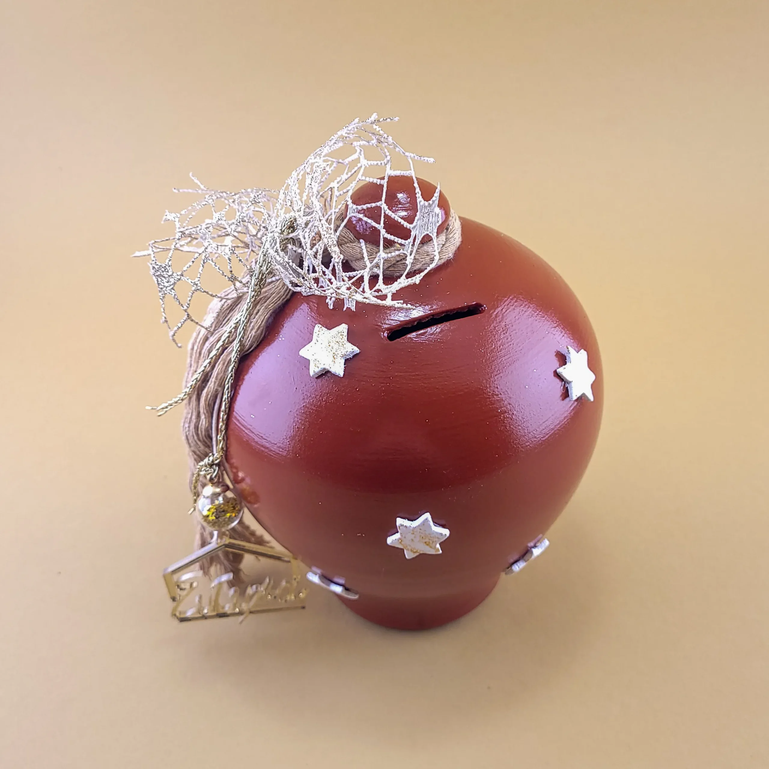 Χειροποίητος κεραμικός κουμπαράς σε κόκκινο χρώμα, διακοσμημένος με λευκά αστέρια από πηλό και φιόγκο. Συνοδεύεται από plexiglass χρυσό κρεμαστό με τη λέξη «Ευτυχία».