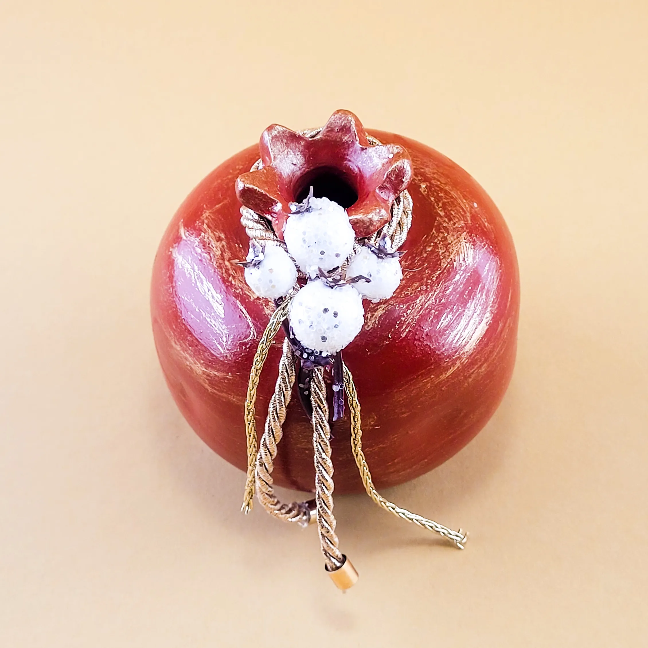 Το ρόδι, σύμβολο τύχης και ευημερίας, διακοσμείται εδώ με λευκές χιονισμένες μπίλιες και πολυτελές χρυσό κορδόνι. Χειροποίητη κατασκευή με προσοχή στη λεπτομέρεια, ιδανική για το νέο έτος και ως διακοσμητικό χώρου.