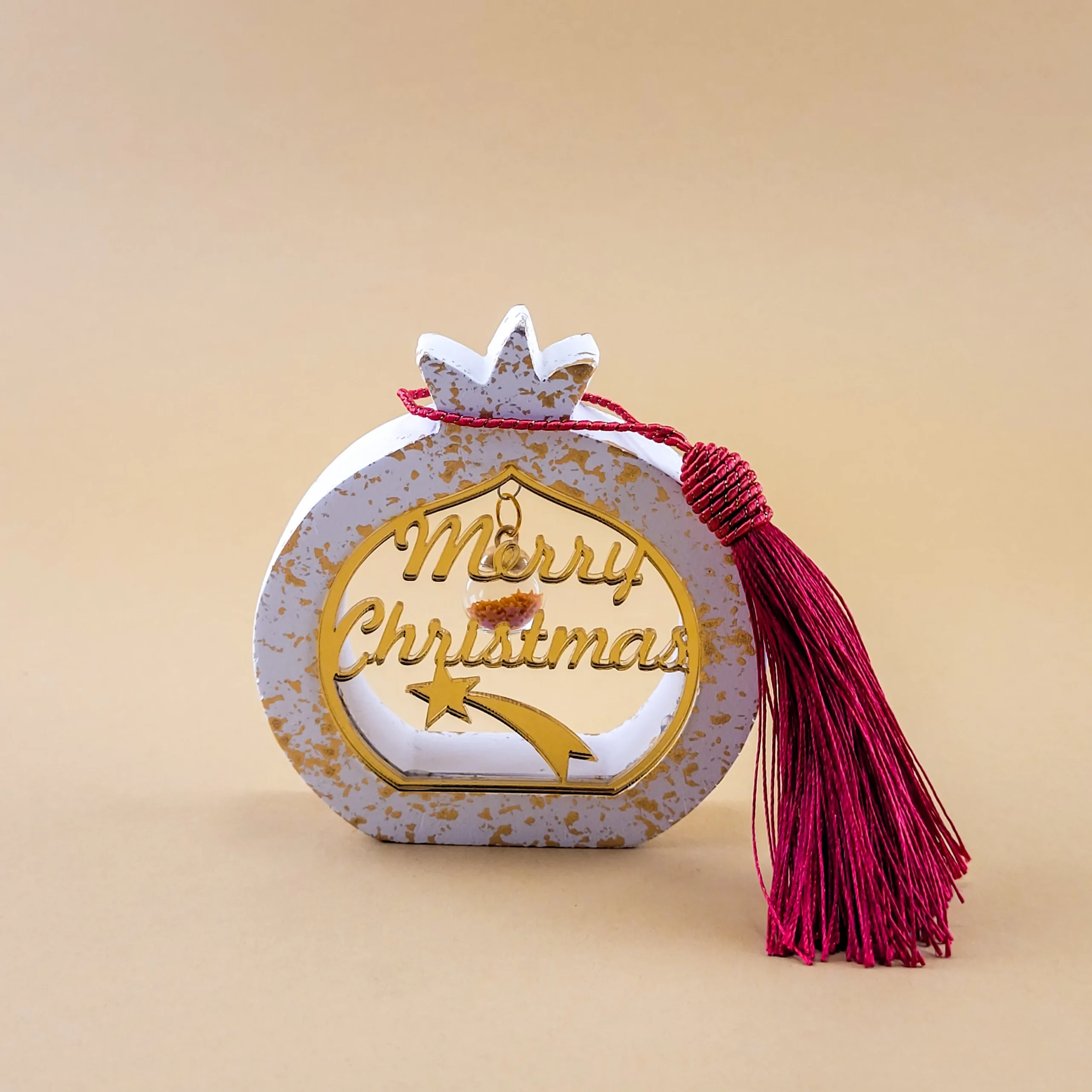 Χριστουγεννιάτικο κεραμικό διακοσμητικό «Merry Christmas» με χρυσές λεπτομέρειες και κόκκινη φούντα. Ιδανικό για γιορτινή διακόσμηση και ως δώρο για αγαπημένα πρόσωπα.