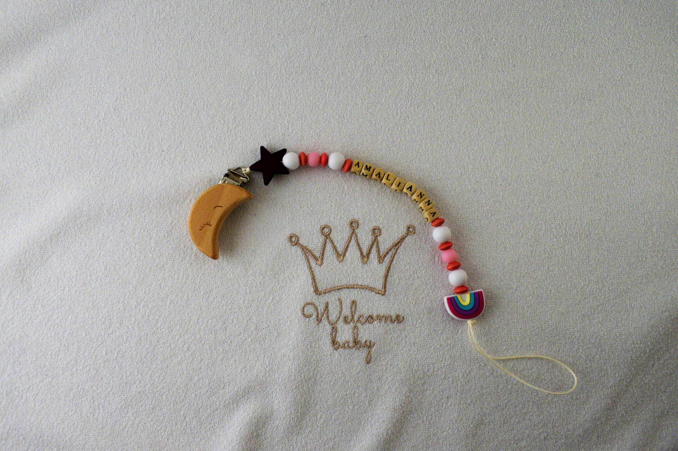 Κλιπ πιπίλας με ξύλινες χάντρες και ξύλινο όνομα η οποία μπορεί να χρησιμοποιηθεί για να έχει το μωρό σας κοντά του την πιπίλα του ή το μασητικό του, καθώς διαθέτει μεταλλικό κλιπ με ξύλινο κάλυμμα για να ασφαλίζει, θηλιά από την άλλη άκρη για το δέσιμο της πιπίλας ή το μασητικό. Ένα όμορφο αξεσουάρ για την πιπίλα του μωρού σας ή για δώρο προσωποποιημένο καθώς αναγράφει το όνομα του αγαπημένου σας βρέφους.