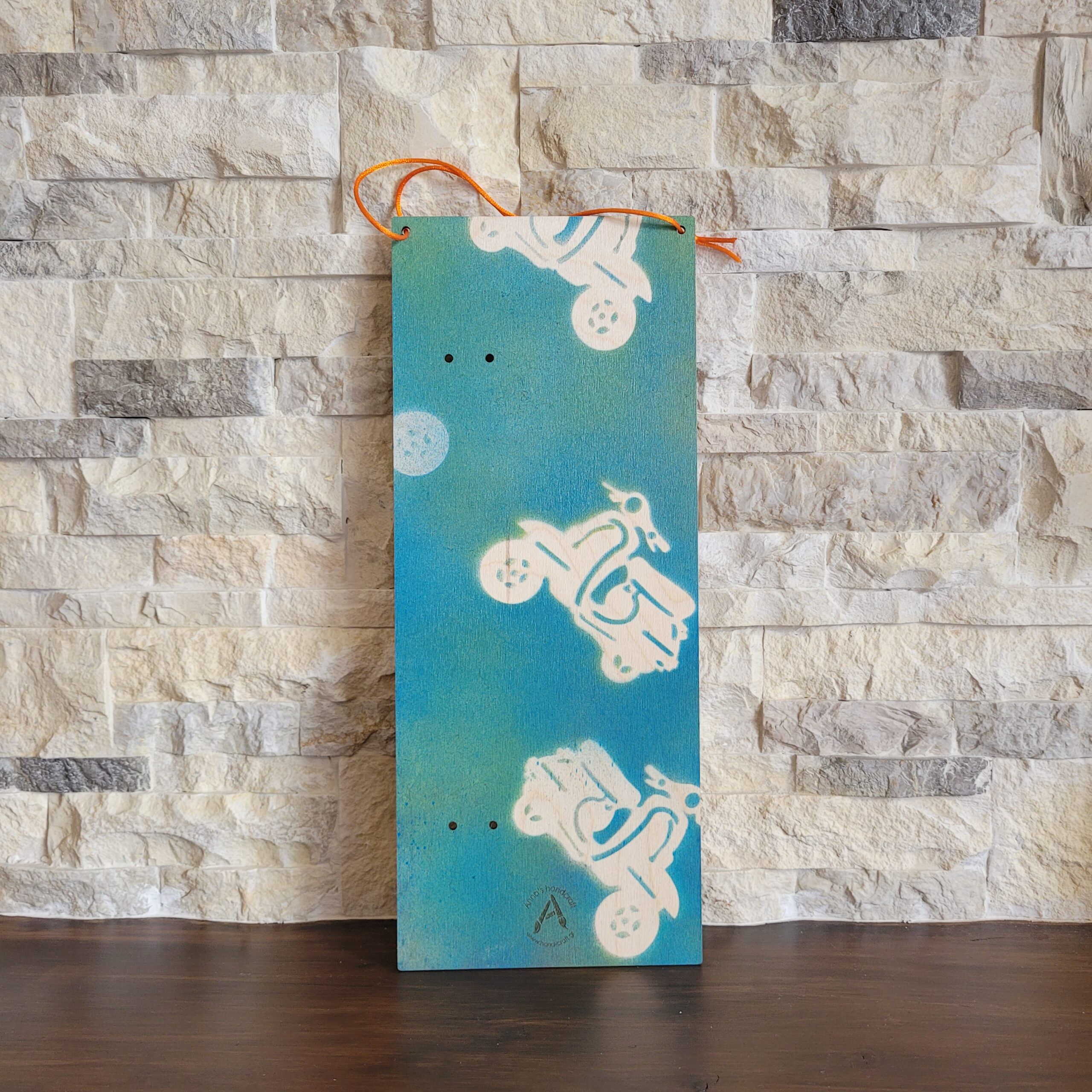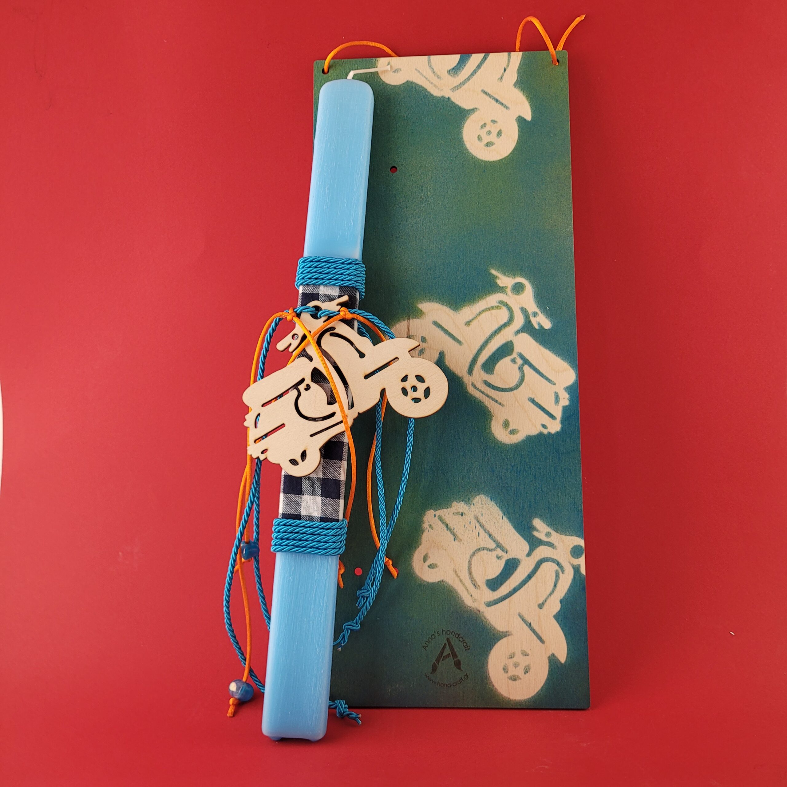 Γαλάζια ξυστή πλακέ λαμπάδα με ξύλινο στοιχείο μαγνητάκι βέσπα, για τους μηχανόβιους φίλους μας! Η λαμπάδα είναι διακοσμημένη με ιδιαίτερες κορδέλες, έχει άρωμα ocean και ύψος 36εκ. Με βάση που γίνεται καδράκι το οποίο μετά μπορείτε να το χρησιμοποιήσετε για την διακόσμηση του χώρου σας!