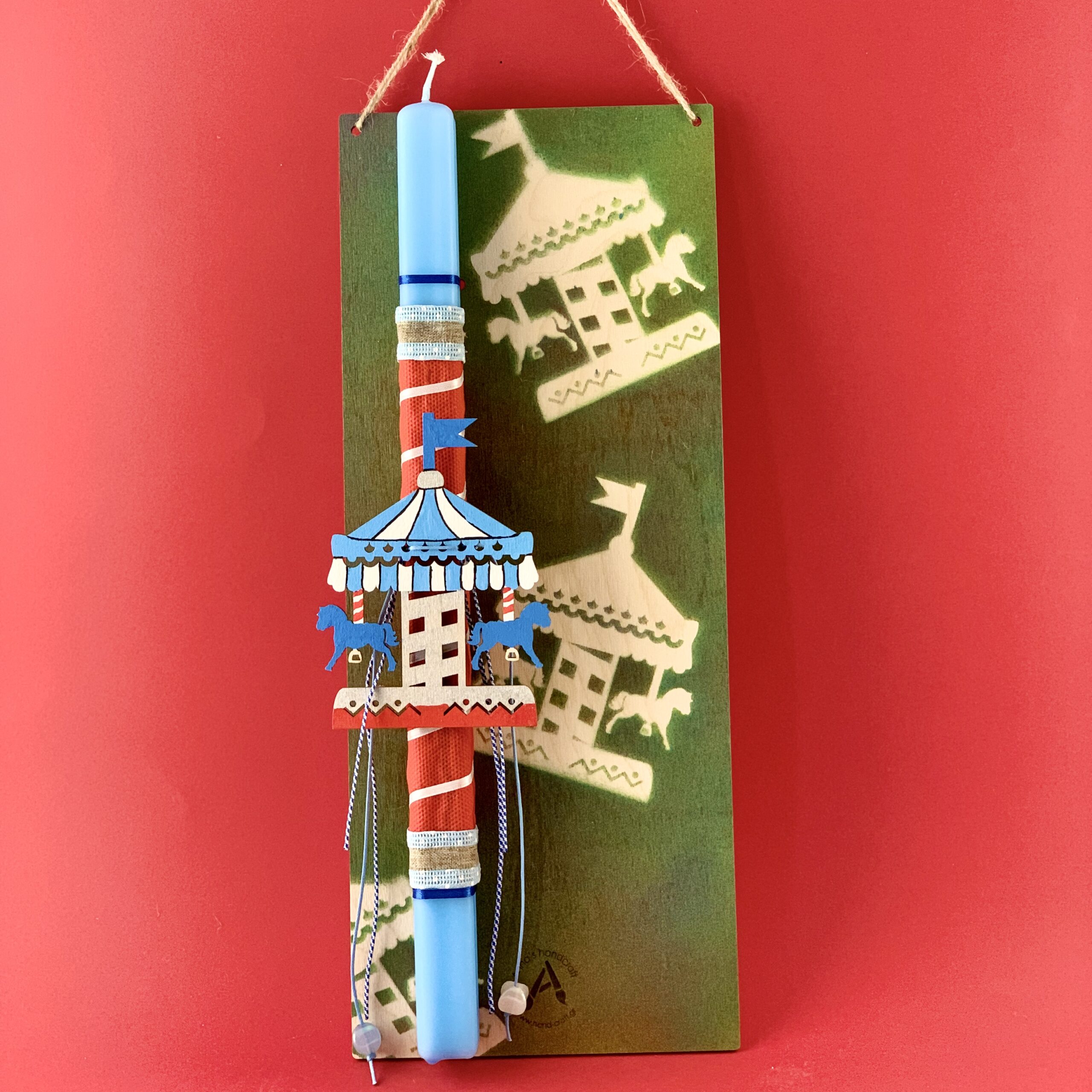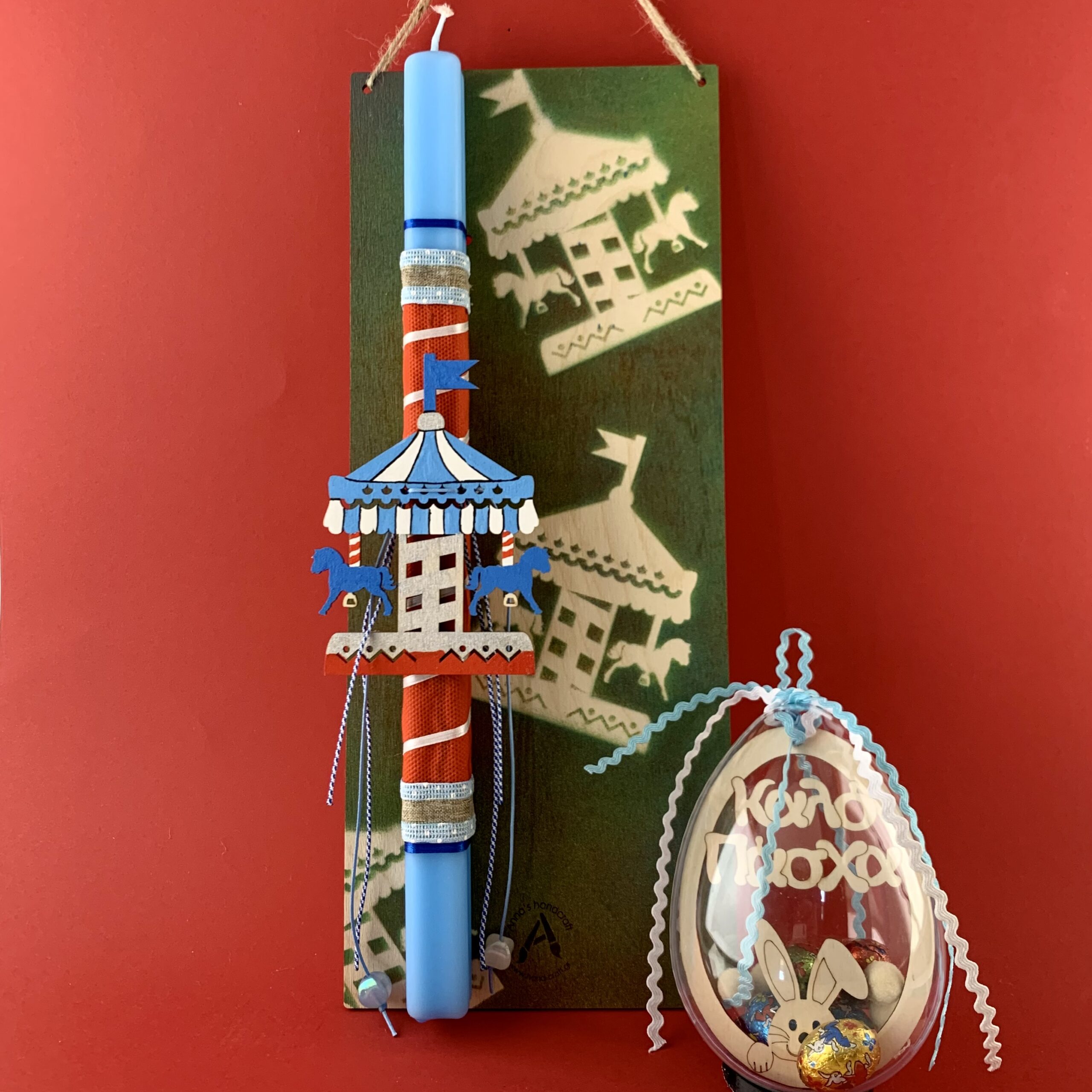 Γαλάζια λαμπάδα με ξύλινο στοιχείο μαγνητάκι καρουζέλ! Διακοσμημένη με ιδιαίτερες κορδέλες. Με βάση που γίνεται καδράκι το οποίο μετά μπορείτε να το χρησιμοποιήσετε για την διακόσμηση του χώρου σας! Αβγό πλέξιγκλας 13εκ. το οποίο περιέχει ξύλινο στοιχείο λαγουδάκι και σοκολατένια αβγουλάκια!