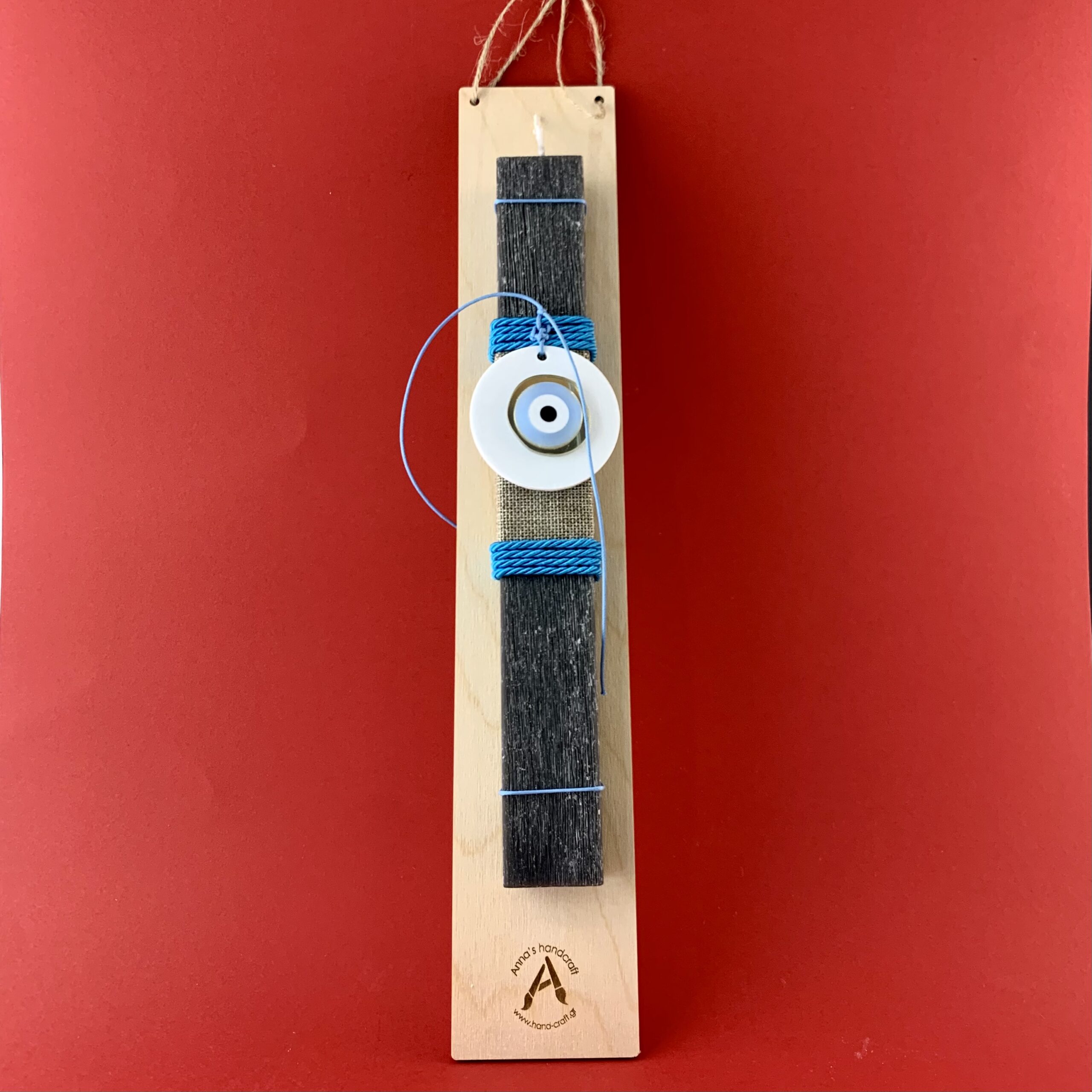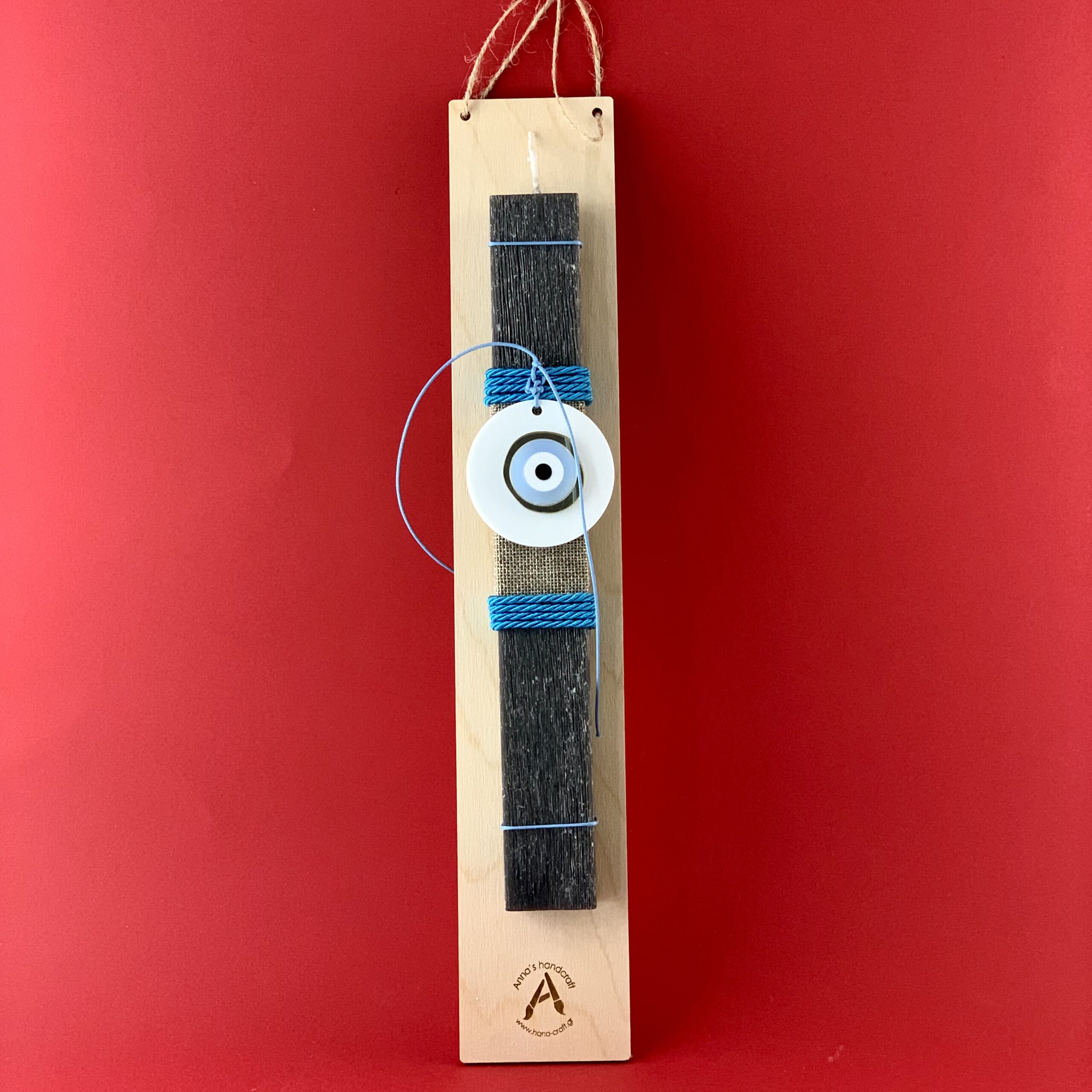 Χειροποίητη αρωματική λαμπάδα διακοσμημένη με ξύλινη βάση με πλεξιγκλάς στοιχείο μάτι!!!