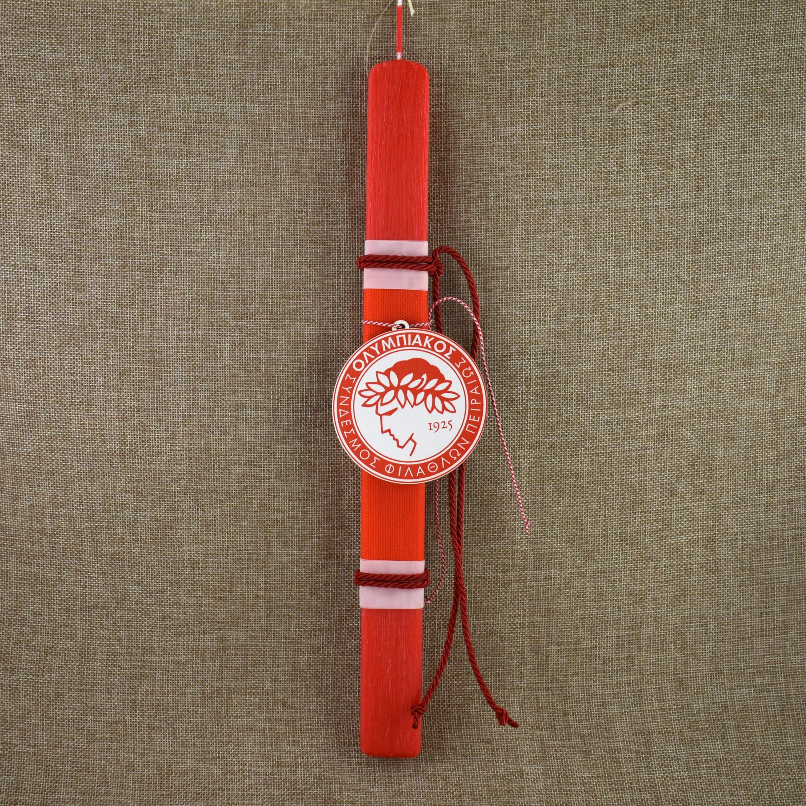 Κόκκινη ξυστή πλακέ λαμπάδα με ξύλινο στοιχείο μαγνητάκι του Ολυμπιακού! Διακοσμημένη με ιδιαίτερες κορδέλες. Η λαμπάδα είναι με άρωμα κανέλας και ύψος 36εκ. Μπορείτε να επιλέξετε διαφορετικό χρώμα λαμπάδας.
