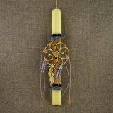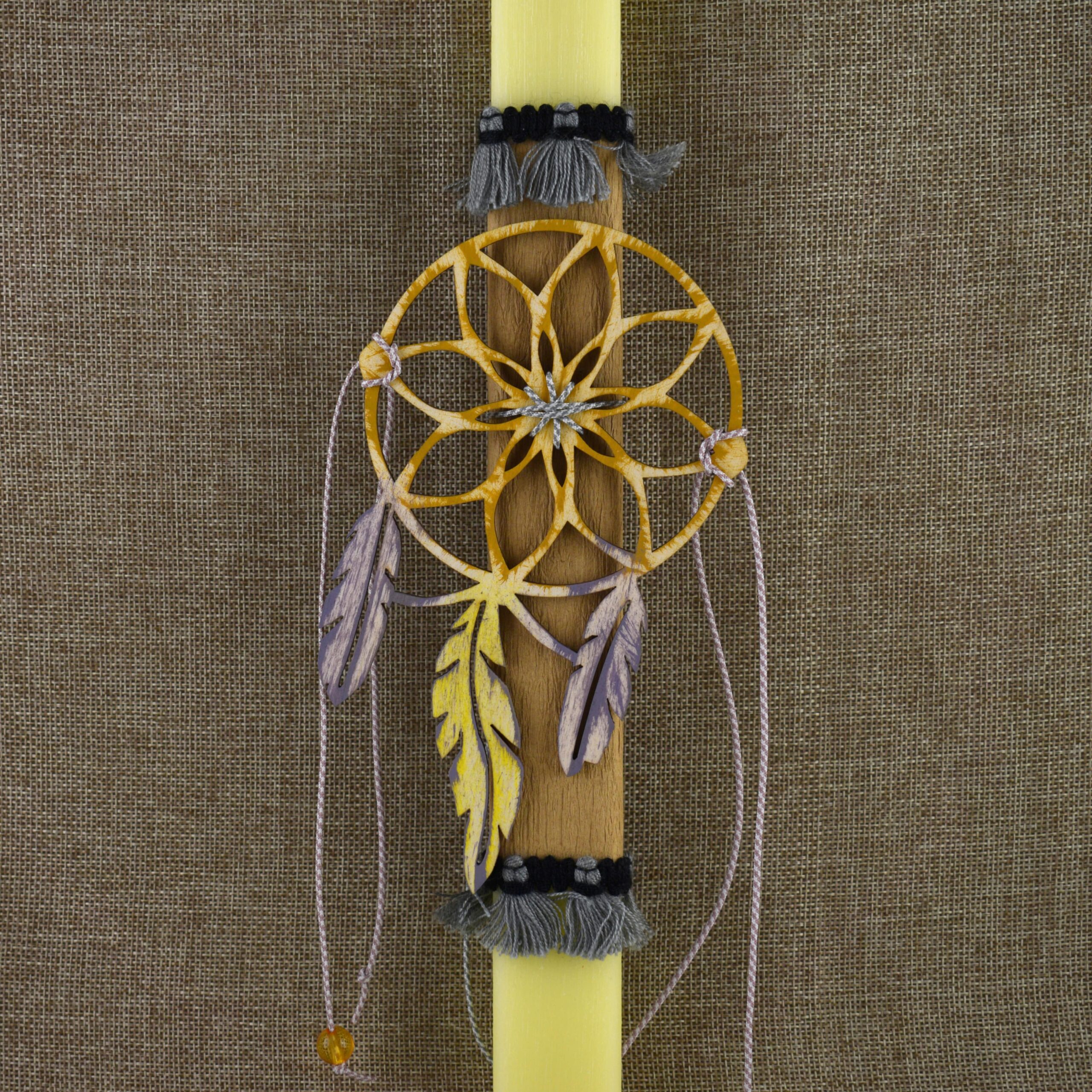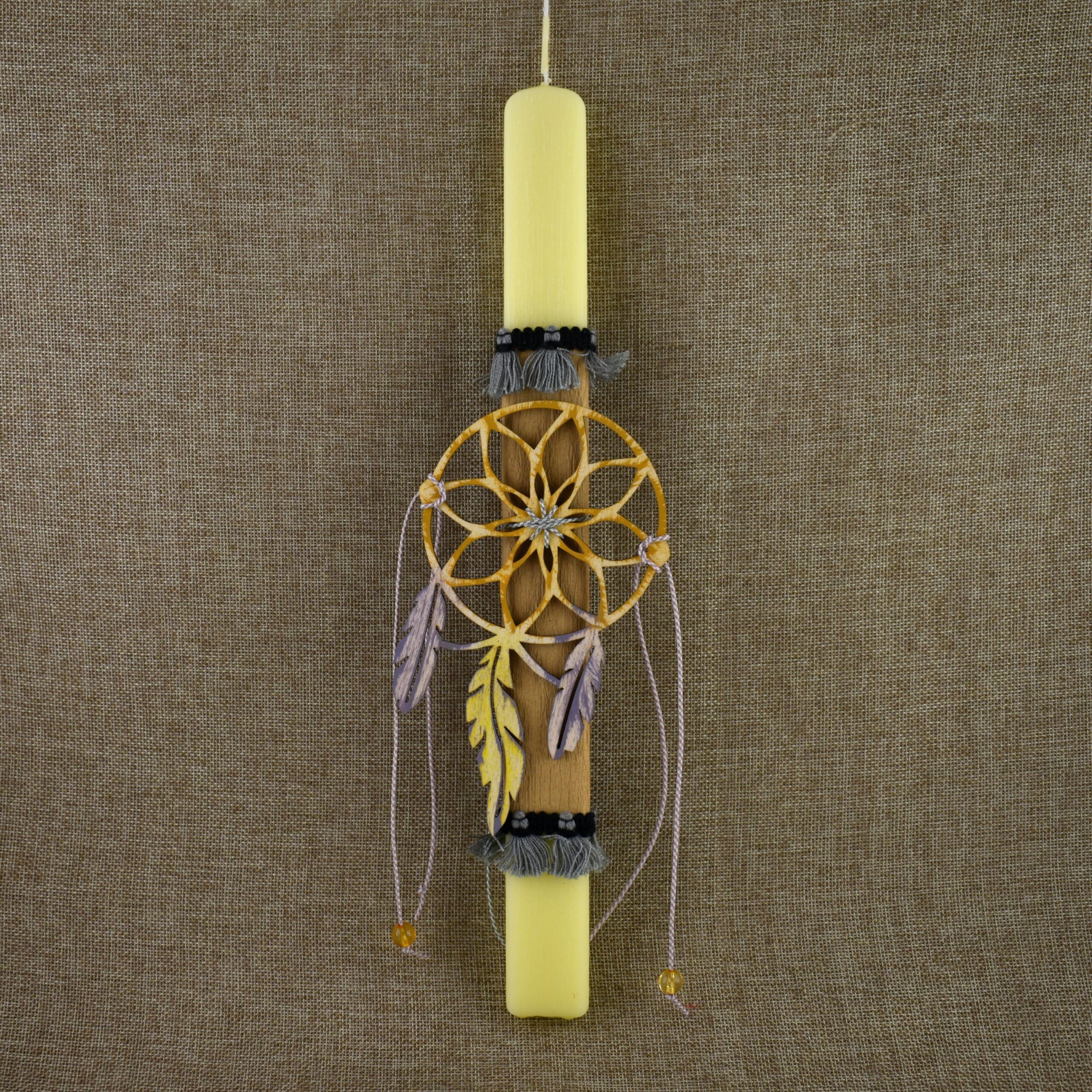 Κίτρινη ξυστή πλακέ λαμπάδα με ξύλινο στοιχείο ονειροπαγίδα, διακοσμημένη με ιδιαίτερες κορδέλες! Η λαμπάδα είναι με άρωμα βανίλια και έχει ύψος 36 εκ. Μπορείτε να επιλέξετε διαφορετικό χρώμα λαμπάδας.