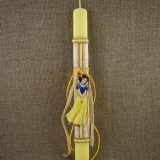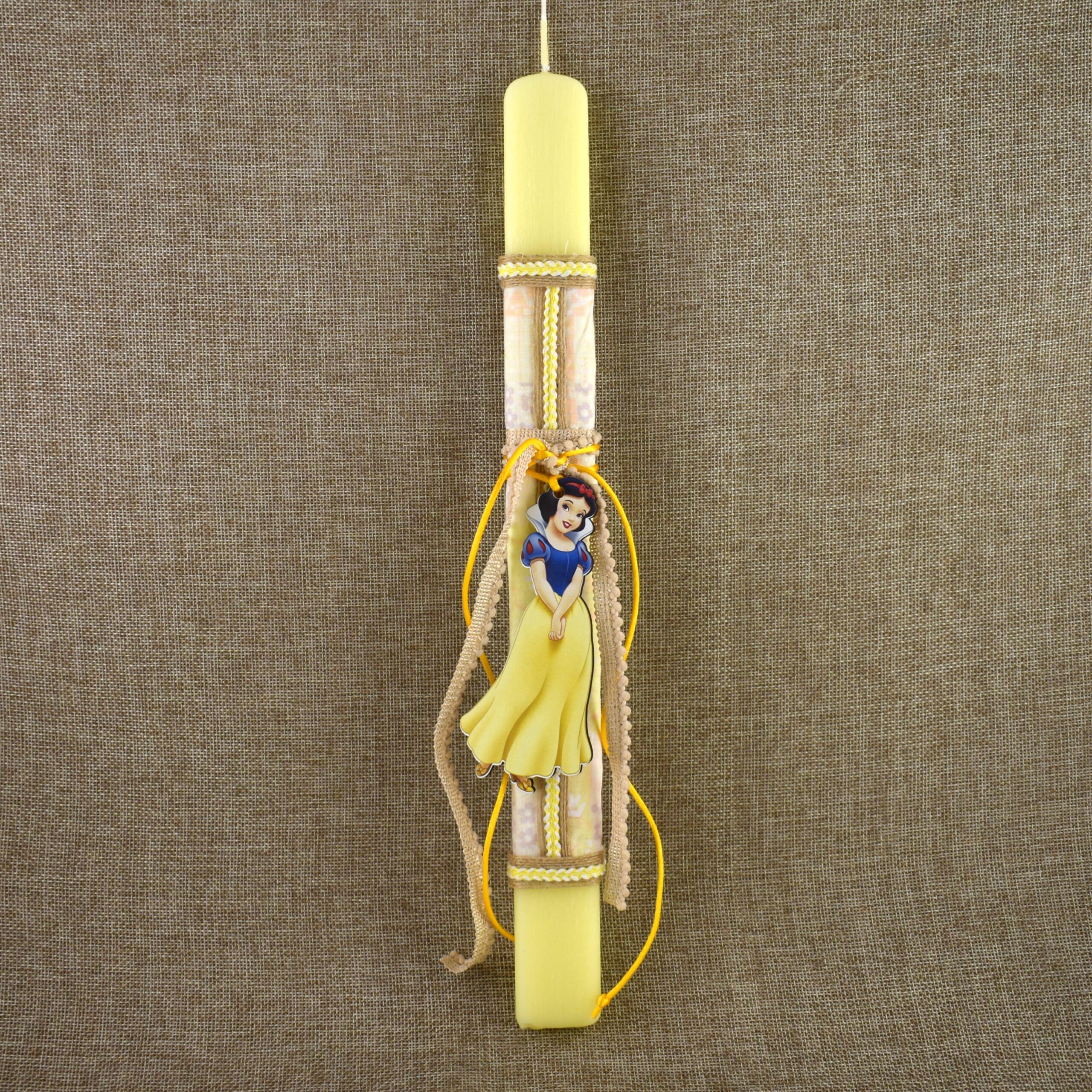 Κίτρινη ξυστή πλακέ λαμπάδα με ξύλινο στοιχείο μαγνητάκι με την αγαπημένη μας Χιονάτη! Διακοσμημένη με ιδιαίτερες κορδέλες!
