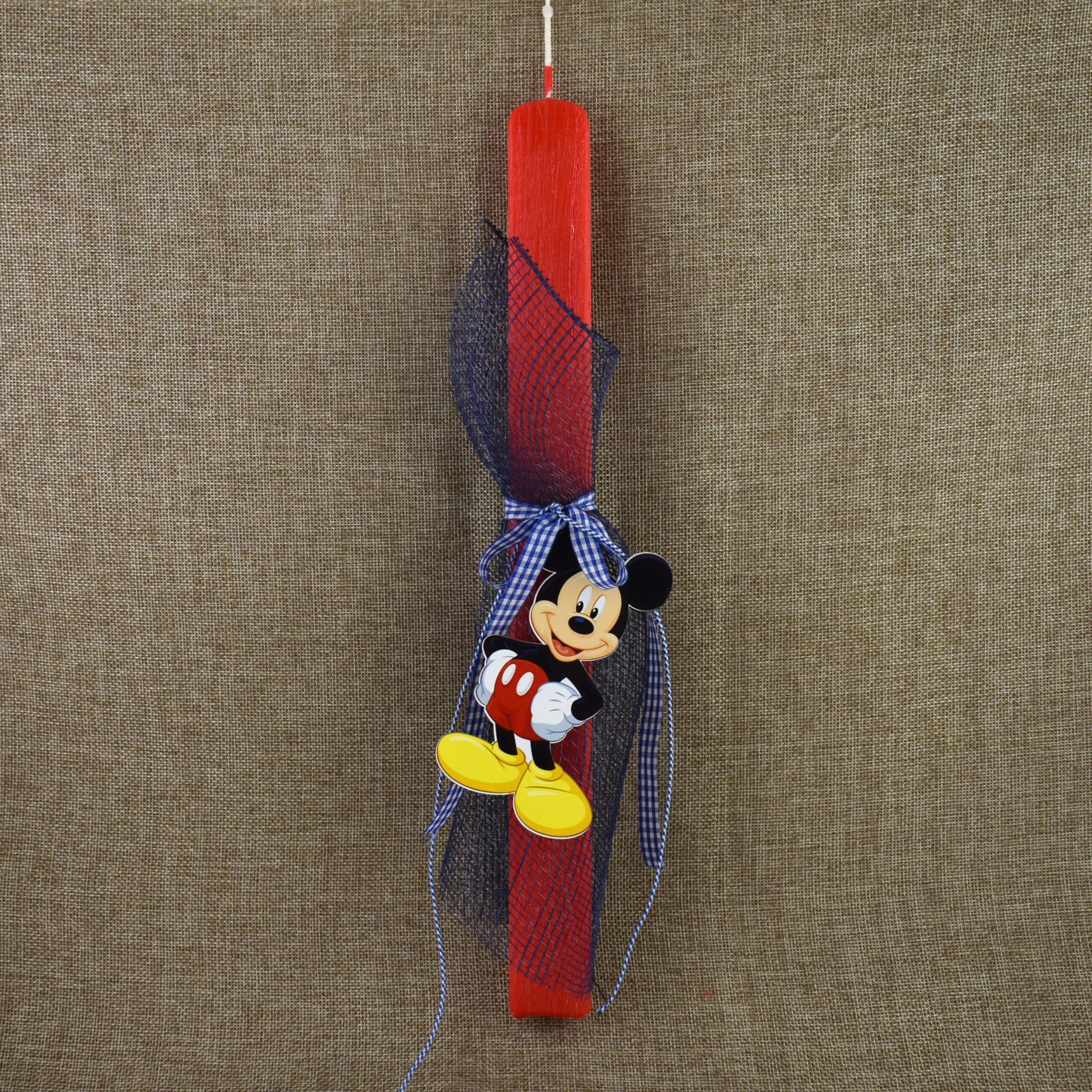 Κόκκινη ξυστή πλακέ λαμπάδα με ξύλινο στοιχείο μαγνητάκι με τον λατρεμένο μας Mickey mouse, διακοσμημένη με ιδιαίτερες κορδέλες και δίχτυ! Η λαμπάδα είναι με άρωμα κανέλας και έχεις ύψος 36εκ. Μπορείτε να επιλέξετε διαφορετικό χρώμα λαμπάδας.