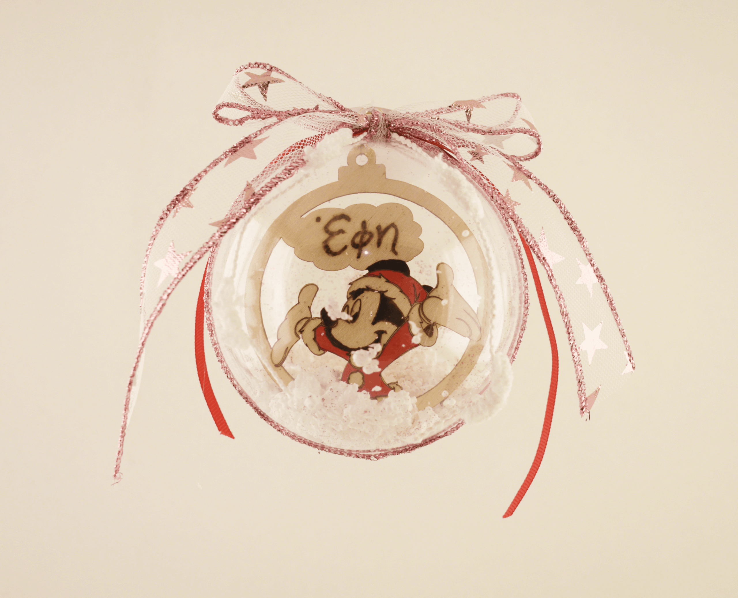 Χριστουγεννιάτικη χειροποίητη μπάλα με την αγαπημένη μας φιγούρα και το όνομα που επιθυμείτε γραμμένο με πυρογράφο.