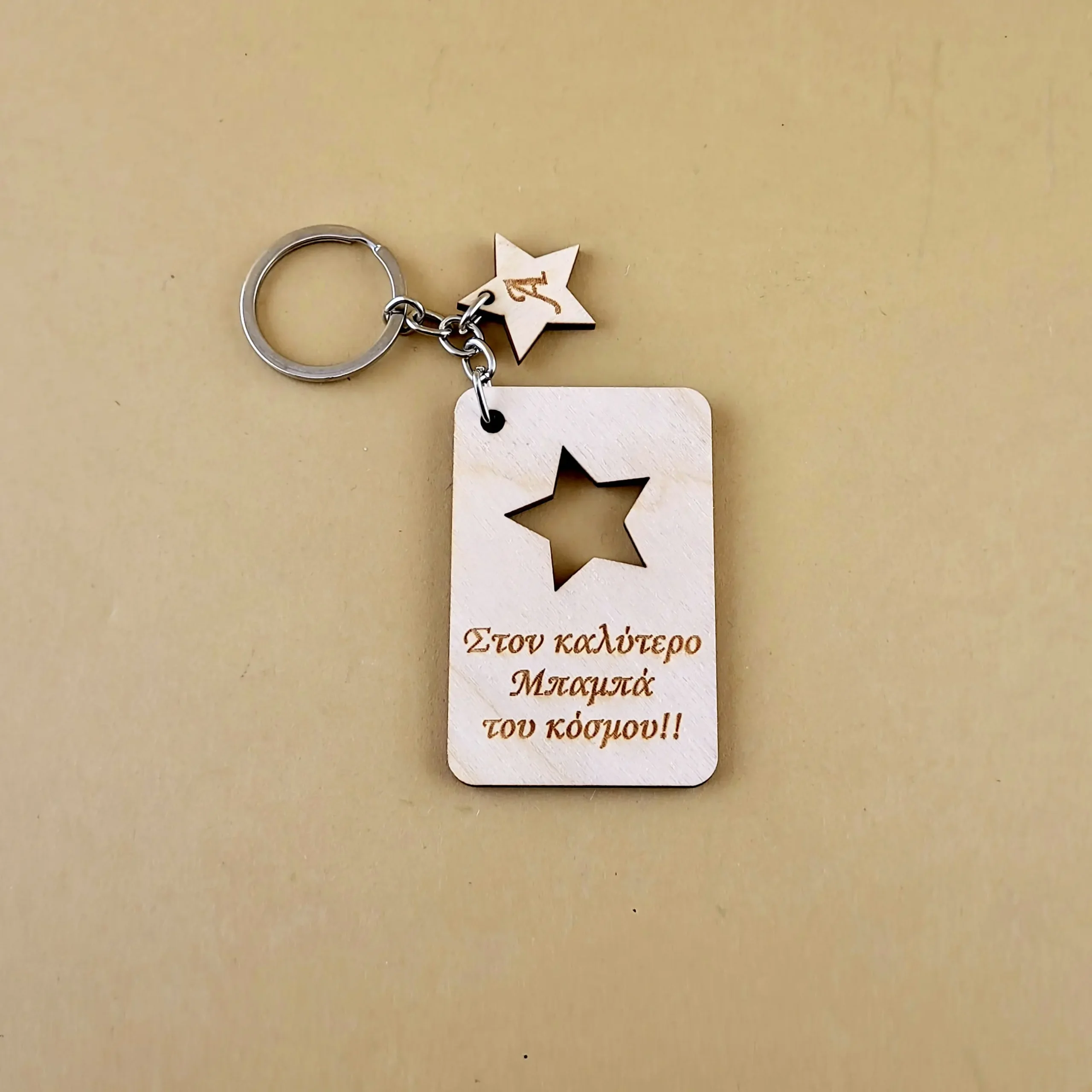 Ψάχνετε για ένα ιδιαίτερο δώρο για τον αγαπημένο σας μπαμπά; Το ξύλινο μπρελόκ “Στον Καλύτερο Μπαμπά του Κόσμου!!” είναι η ιδανική επιλογή! Κατασκευασμένο από υψηλής ποιότητας ξύλο, αυτό το μπρελόκ διαθέτει μια κομψή σχεδίαση με ένα αστεράκι κομμένο στη μέση και ένα μικρό ξύλινο αστεράκι να κρέμεται δίπλα. Η χαραγμένη φράση “Στον Καλύτερο Μπαμπά του Κόσμου!!” κάνει αυτό το μπρελόκ ένα όμορφο και συναισθηματικό δώρο που θα εκτιμηθεί από κάθε μπαμπά. Ιδανικό για την Ημέρα του Πατέρα, τα γενέθλια ή οποιαδήποτε άλλη ειδική περίσταση.