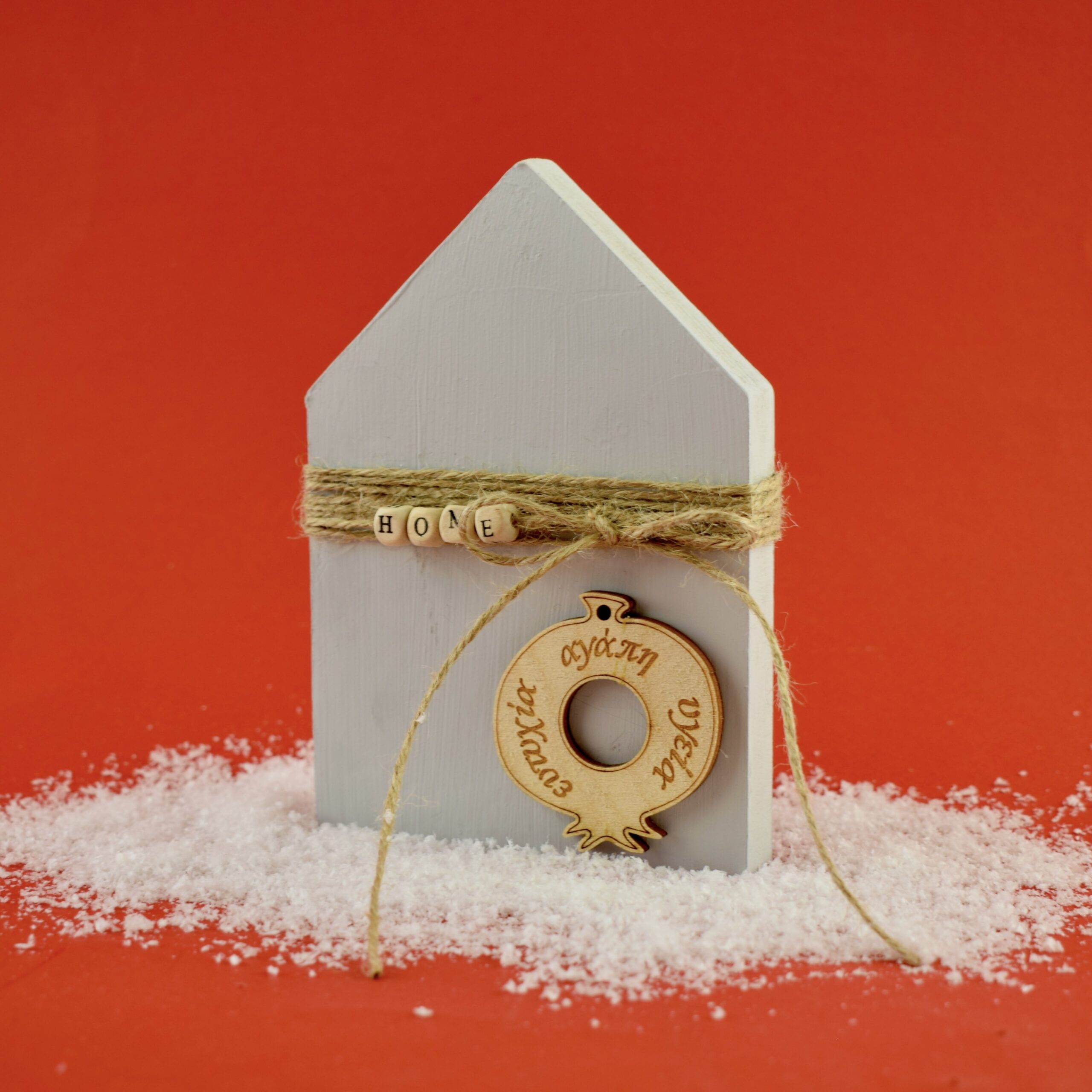 Είναι ζωγραφισμένο με τα χέρια. Το κείμενο “ευτυχία αγάπη υγεία” είναι χαραγμένο σε ξύλινο ρόδι.