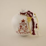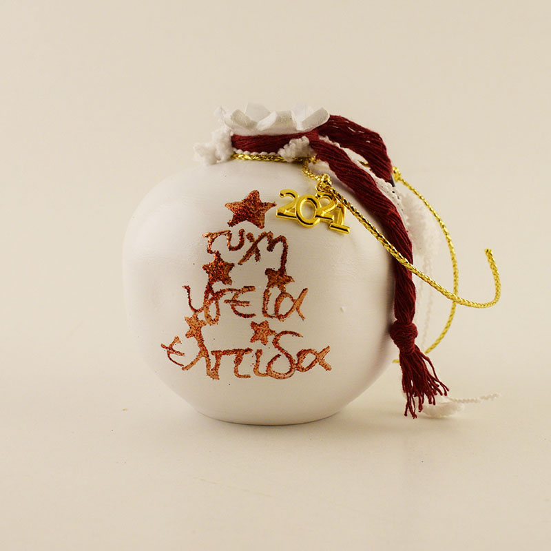 Χειροποίητο πήλινο γούρι ρόδι σε λευκό χρώμα, κόκκινη κορδέλα, ζωγραφισμένο ”τύχη,υγεία,ελπίδα” και ατσάλινο ”2021”