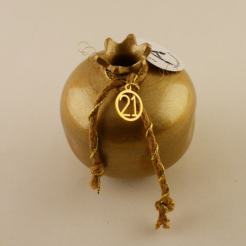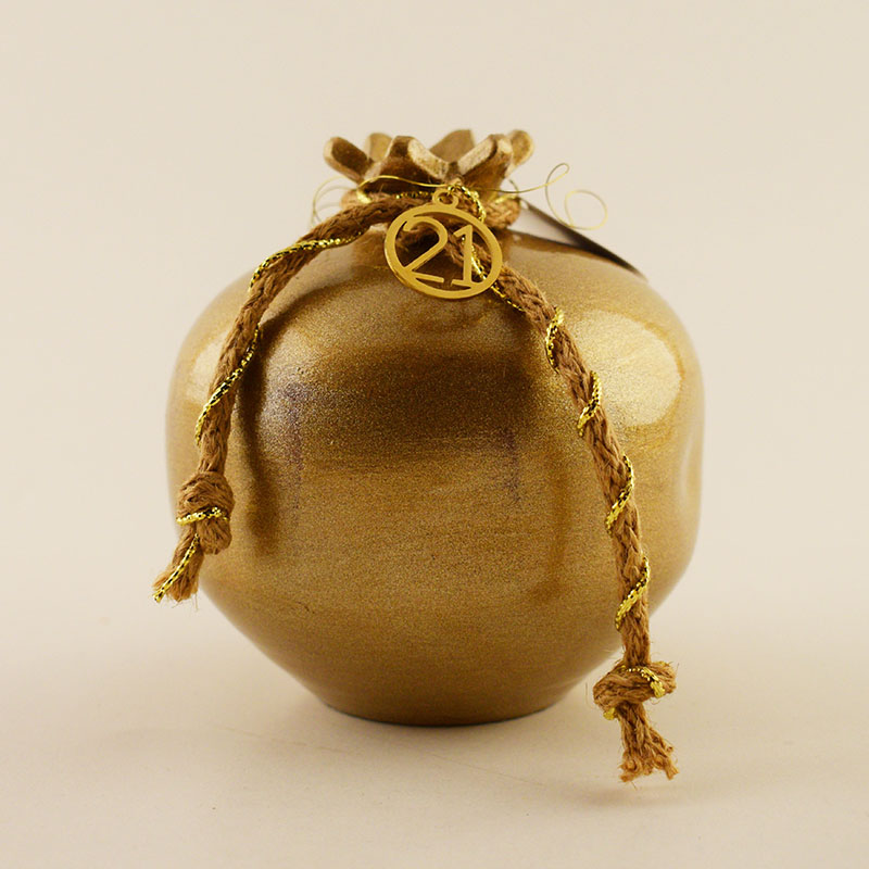 Χειροποίητο πήλινο γούρι ρόδι σε χρυσό χρώμα, χρυσή κορδέλα και ατσάλινο ”21”