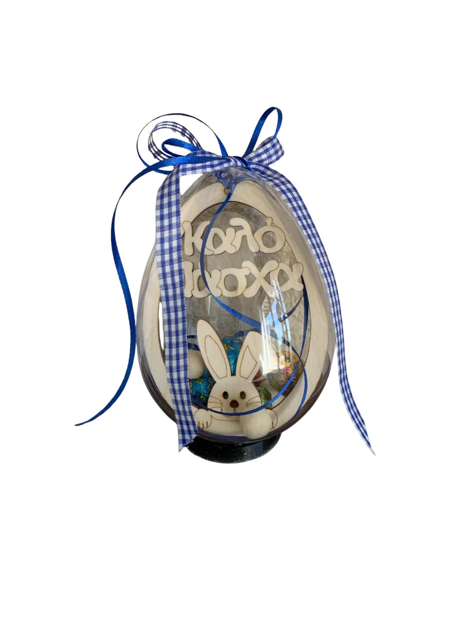 Αυγό πλέξιγκλας 13εκ. το οποίο περιέχει ξύλινο στοιχείο λαγουδάκι στολισμένο με σοκολατένια αυγουλάκια και με ιδιαίτερες μπλε κορδέλες!