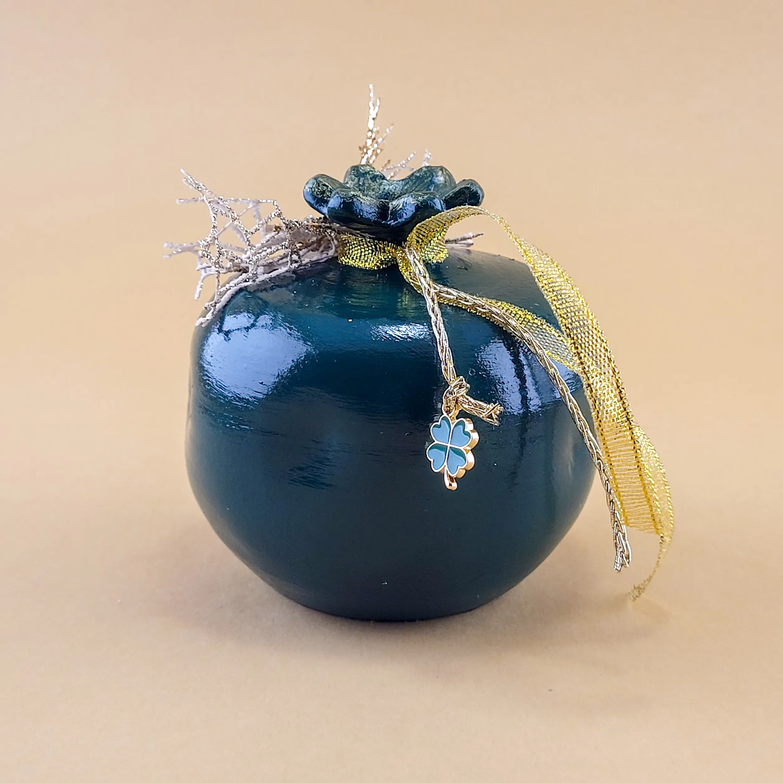 Χειροποίητο κεραμικό ρόδι σε σκούρο πράσινο χρώμα, με χρυσό κορδόνι και μεταλλικό κρεμαστό τυχερό τετράφυλλο. Το ιδανικό δώρο για να φέρετε τύχη και ομορφιά στο χώρο σας.