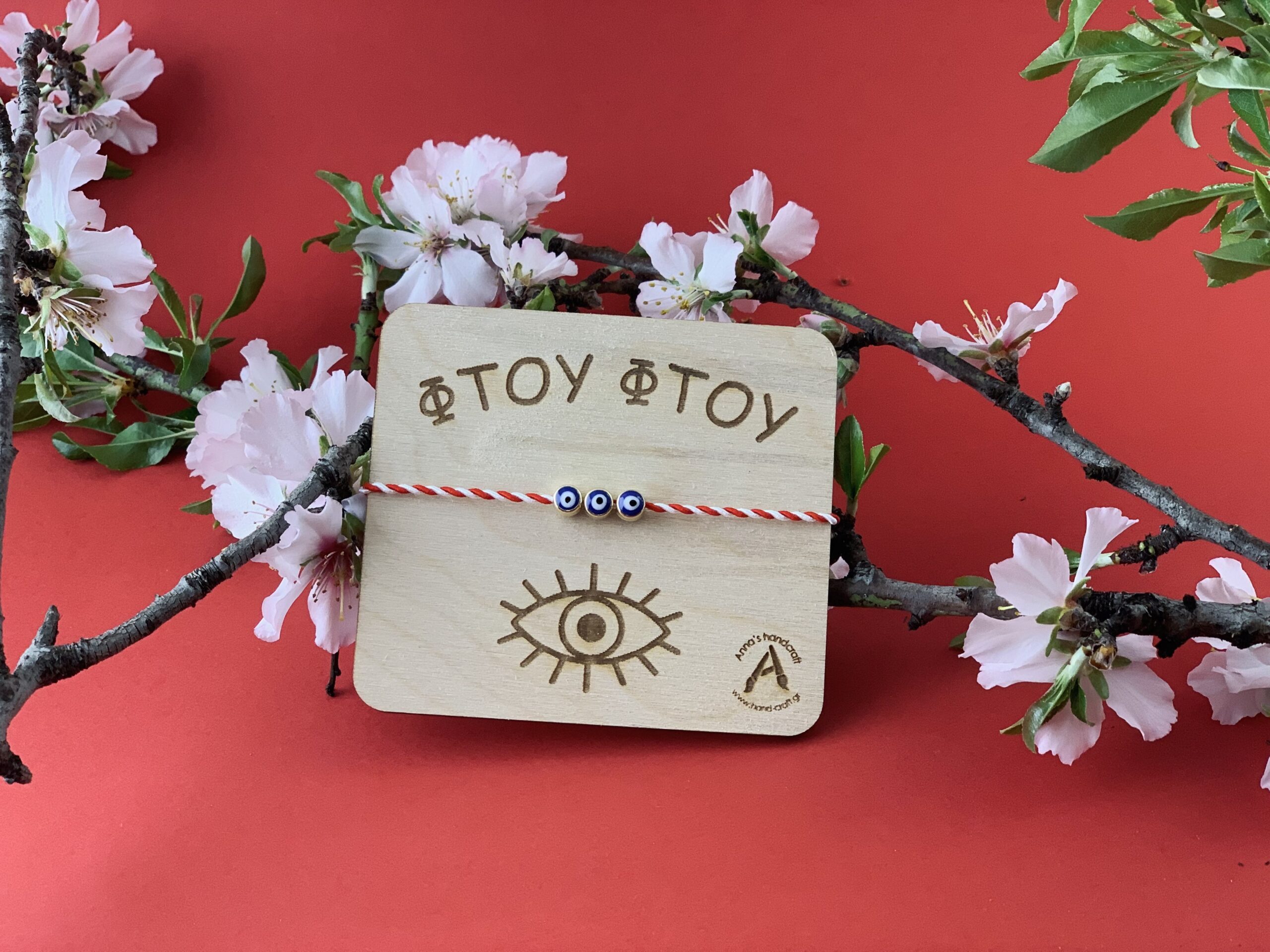 Χειροποίητο βραχιόλι μαρτάκι με 3 μπλέ ματάκια και ρυθμιζόμενο κόκκινο-άσπρο κορδόνι σε ξύλινο στοιχείο, ένα αγαπημένο διαχρονικό δώρο για όλους!