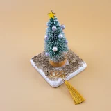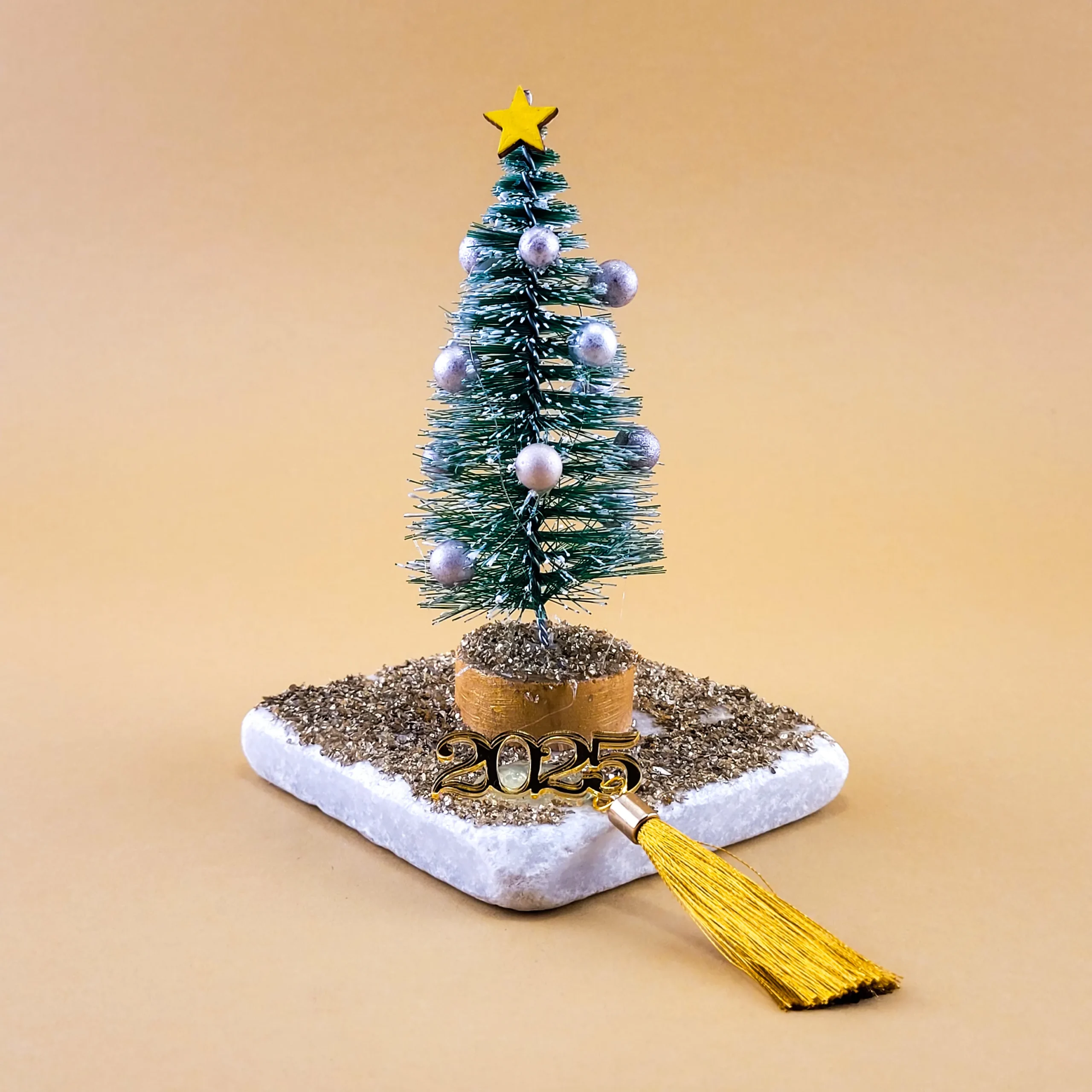 Χειροποίητο δεντράκι με γιορτινή μαρμάρινη βάση, γούρι 2025 και χρυσή φούντα. Ιδανικό για χριστουγεννιάτικη διακόσμηση και δώρο τύχης.