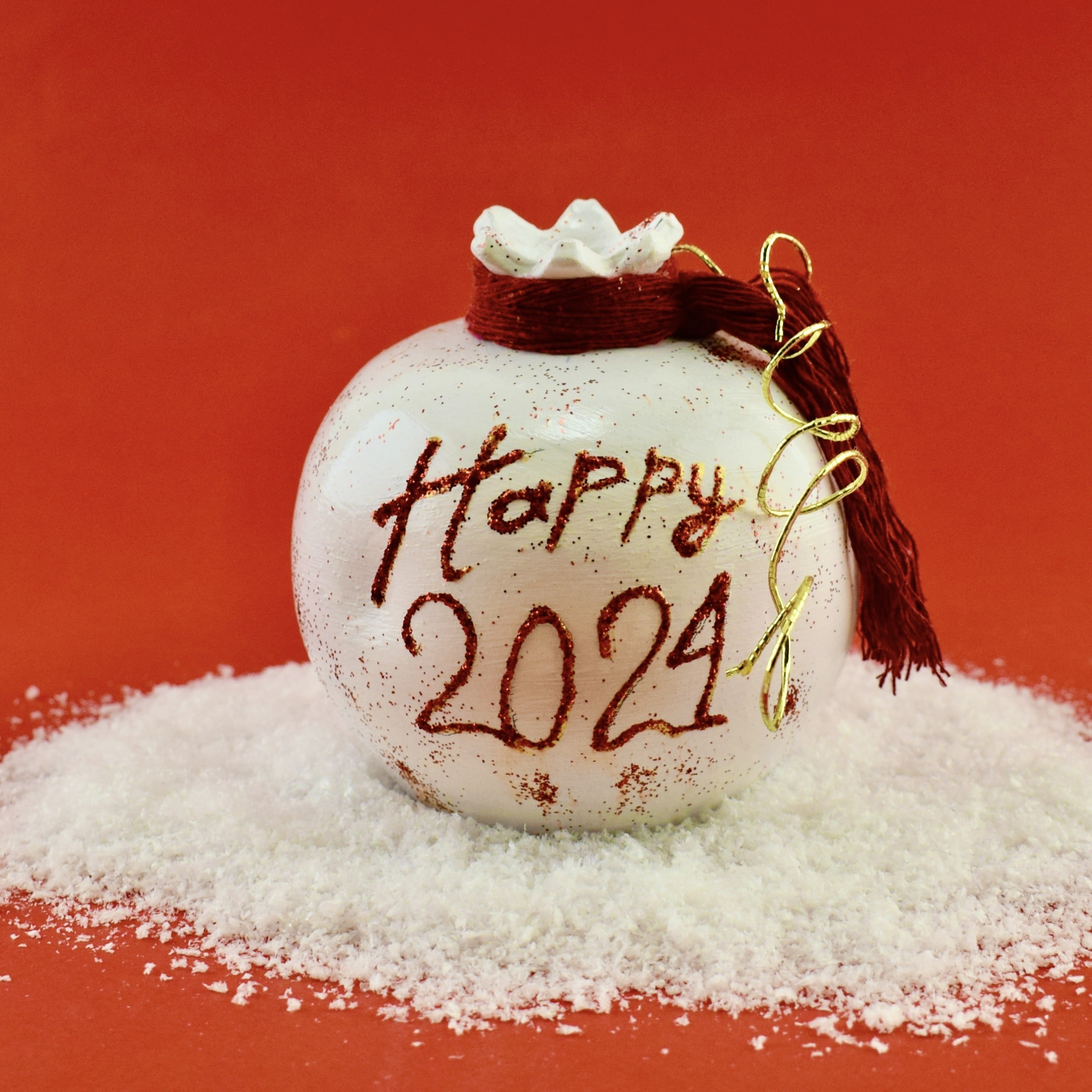Αυτό το χειροποίητο χριστουγεννιάτικο ρόδι είναι φτιαγμένο από πηλό και με “Happy 2024” ζωγραφισμένο στο χέρι με ζωντανά χρώματα και περίτεχνα σχέδια.