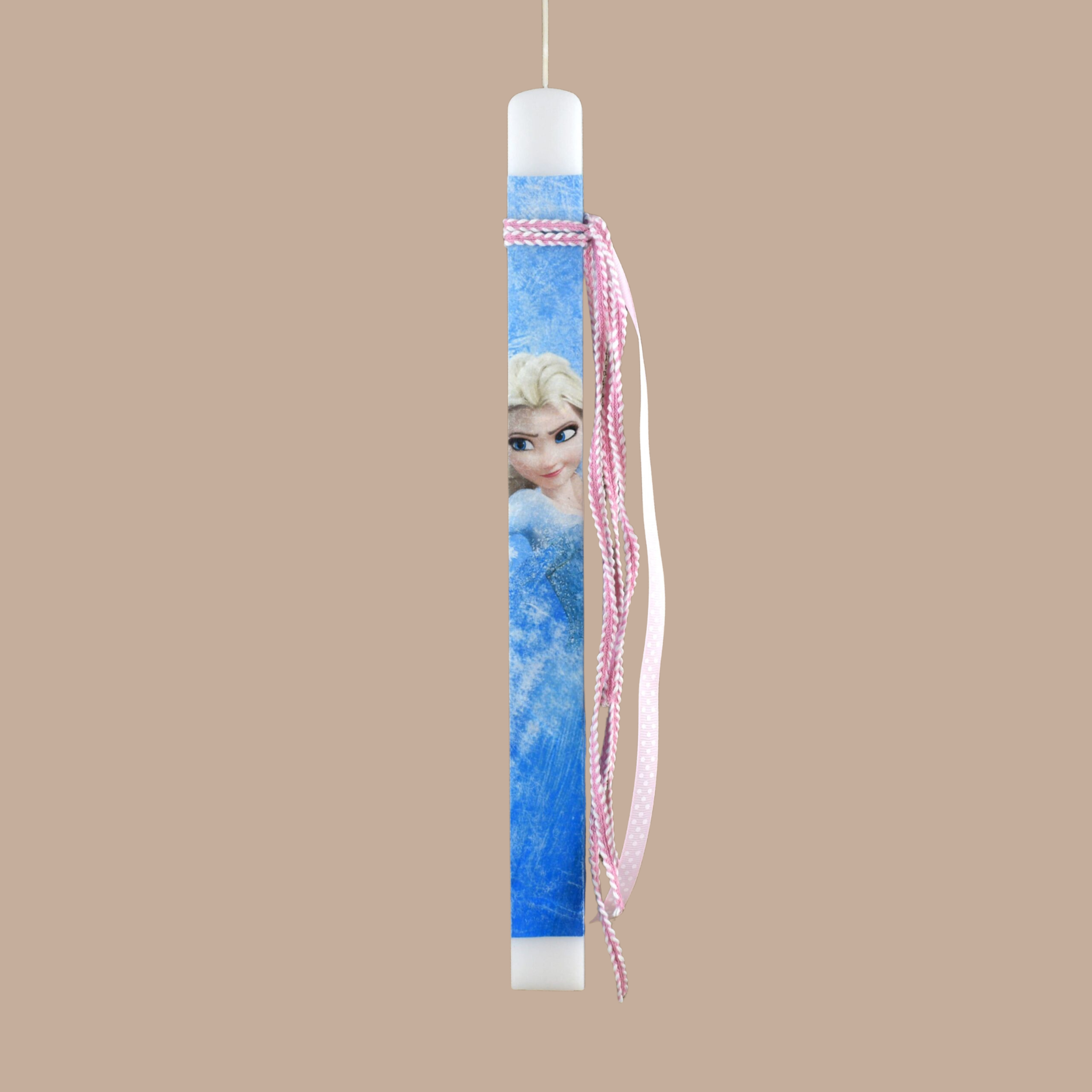 • Ο Σχεδιασμός: Μια λευκή πλακέ λαμπάδα που φιλοξενεί την εντυπωσιακή φιγούρα της Έλσα σε γαλάζιες αποχρώσεις, εφαρμοσμένη με την προσεγμένη τεχνική του ντεκουπάζ.