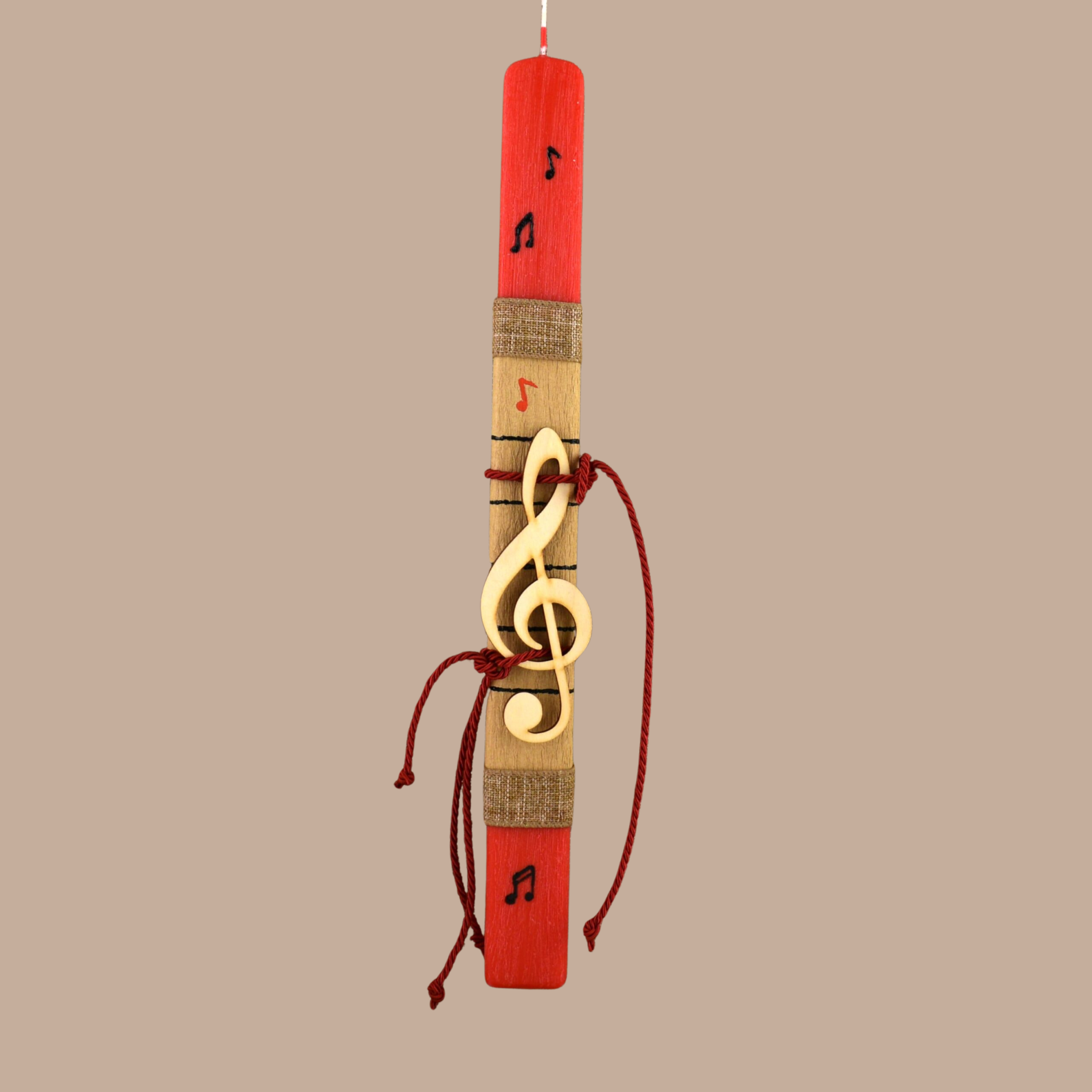 • Το Στοιχείο: Διακοσμημένη με ένα περίτεχνο ξύλινο Κλειδί του Σολ, το οποίο συνοδεύεται από χειροποίητη ζωγραφική (νότες) πάνω στο σώμα του κεριού, δημιουργώντας ένα ολοκληρωμένο εικαστικό αποτέλεσμα.