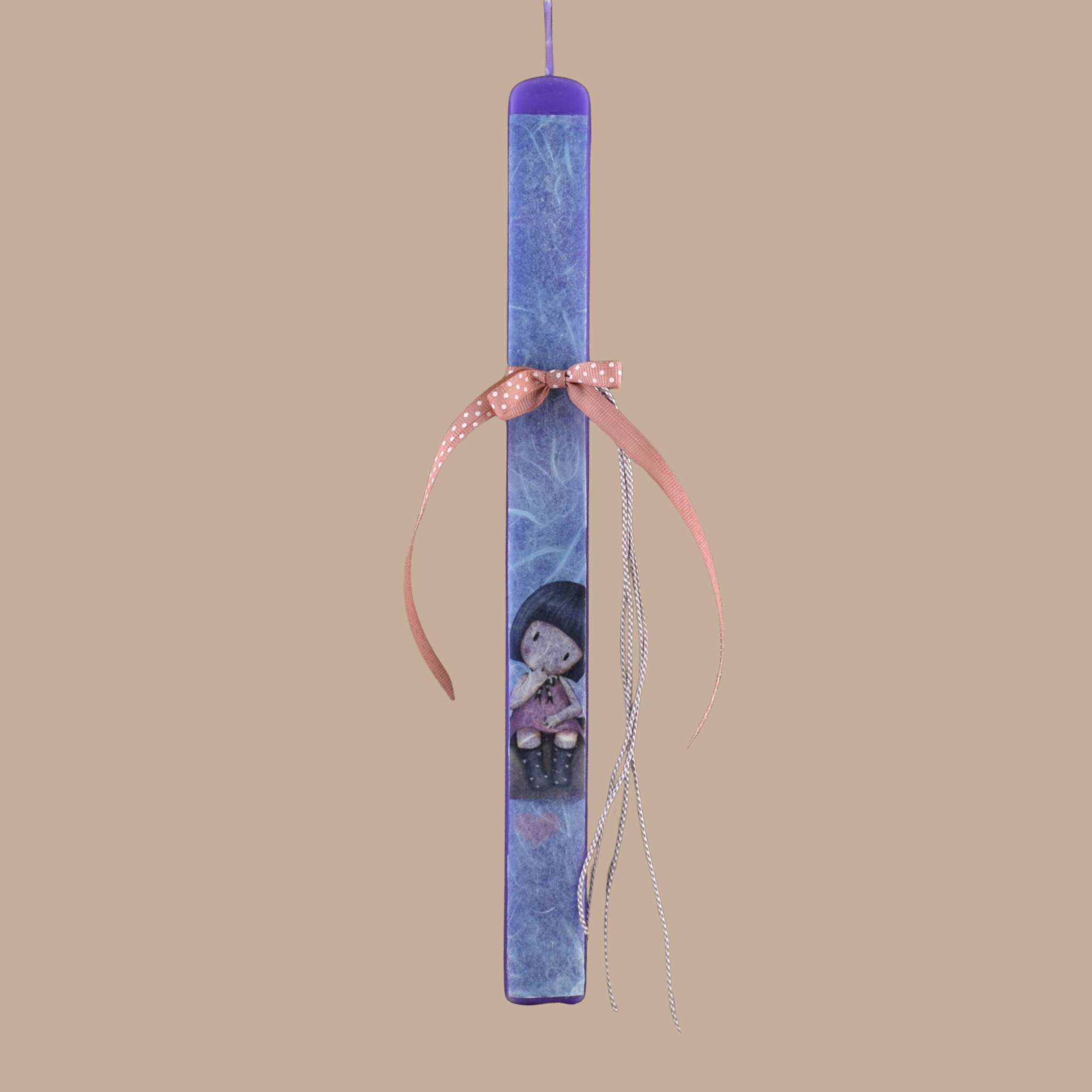 • Ο Σχεδιασμός: Μια εντυπωσιακή μωβ πλακέ ξυστή λαμπάδα που φιλοξενεί τη χαρακτηριστική φιγούρα της Santoro, εφαρμοσμένη με την προσεγμένη τεχνική του ντεκουπάζ.