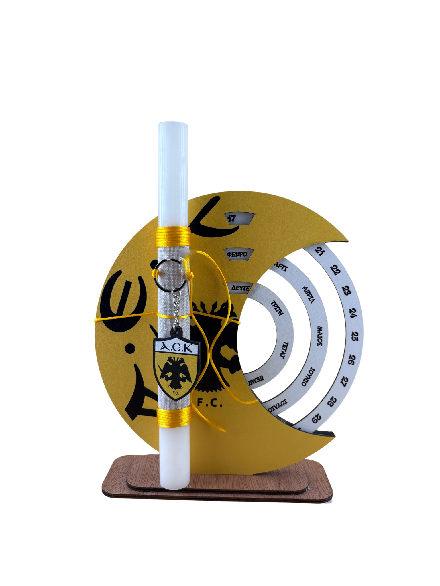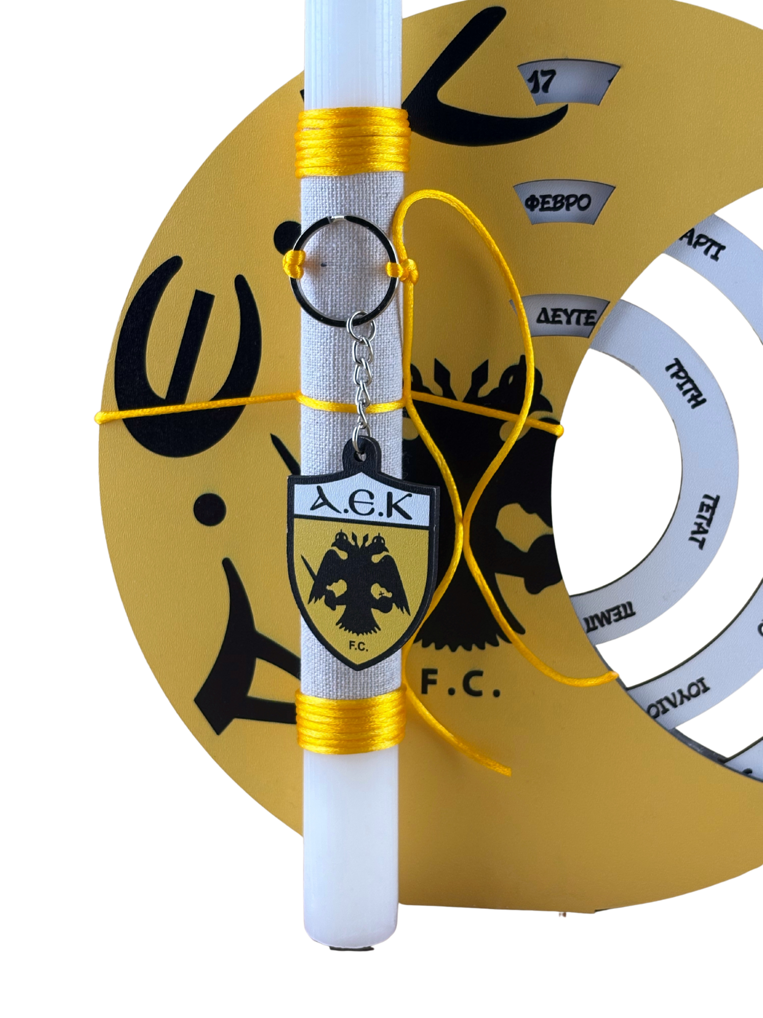 • Ξύλινο Μπρελόκ: Πάνω στη λαμπάδα υπάρχει αποσπώμενο μπρελόκ με το σήμα της ΑΕΚ F.C., έτοιμο να κοσμήσει τα κλειδιά σας.