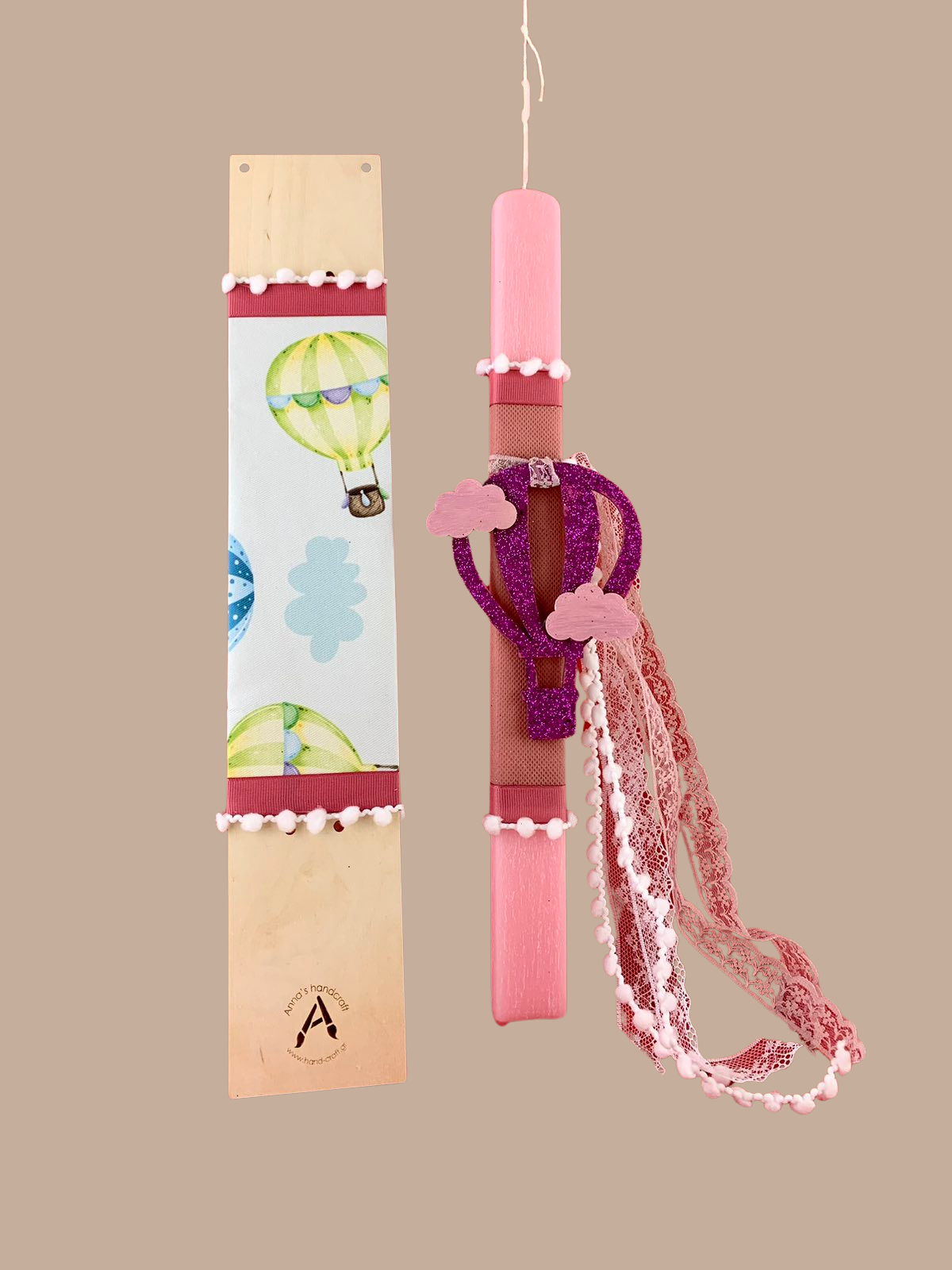 • Περιλαμβάνει ξύλινα στοιχεία (αερόστατο και συννεφάκια) σε παστέλ ροζ και λευκούς τόνους.