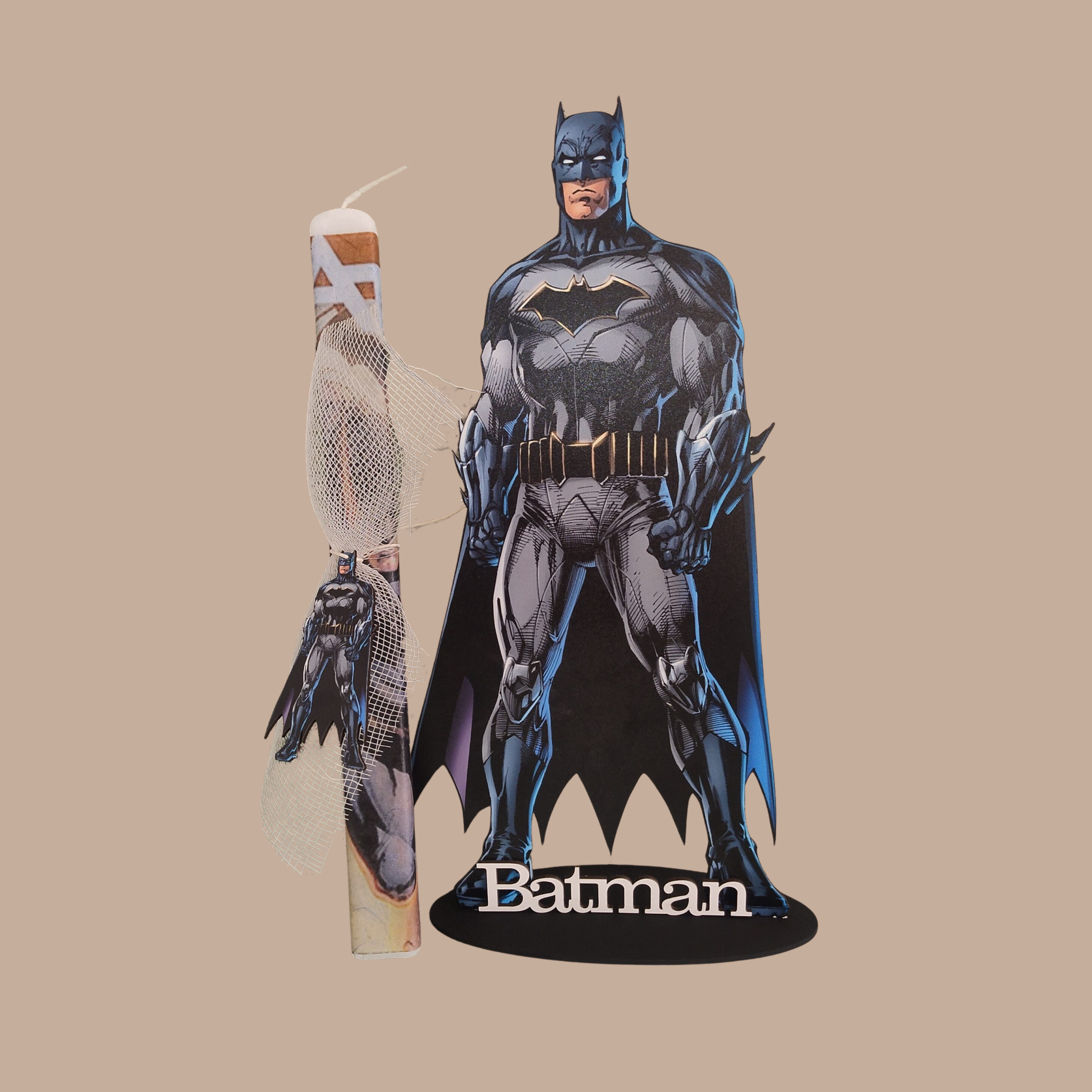 • Η Ξύλινη Φιγούρα: Το σετ περιλαμβάνει μια επιβλητική, χειροποίητη ξύλινη φιγούρα Batman ύψους 40 εκατοστών. Είναι σχεδιασμένη για να στέκεται δίπλα στη λαμπάδα και στη συνέχεια να αποτελέσει ένα μοναδικό διακοσμητικό κομμάτι για το παιδικό δωμάτιο.
