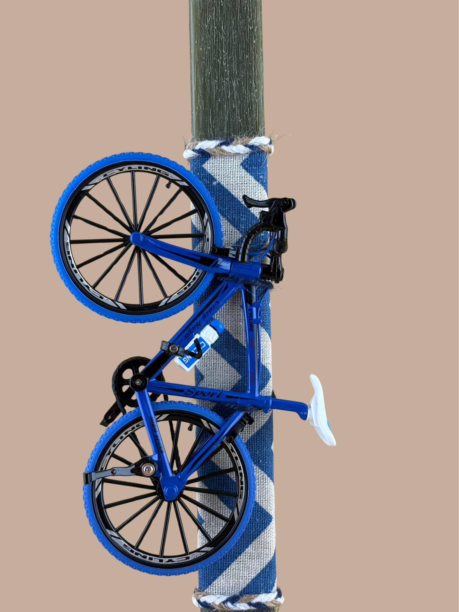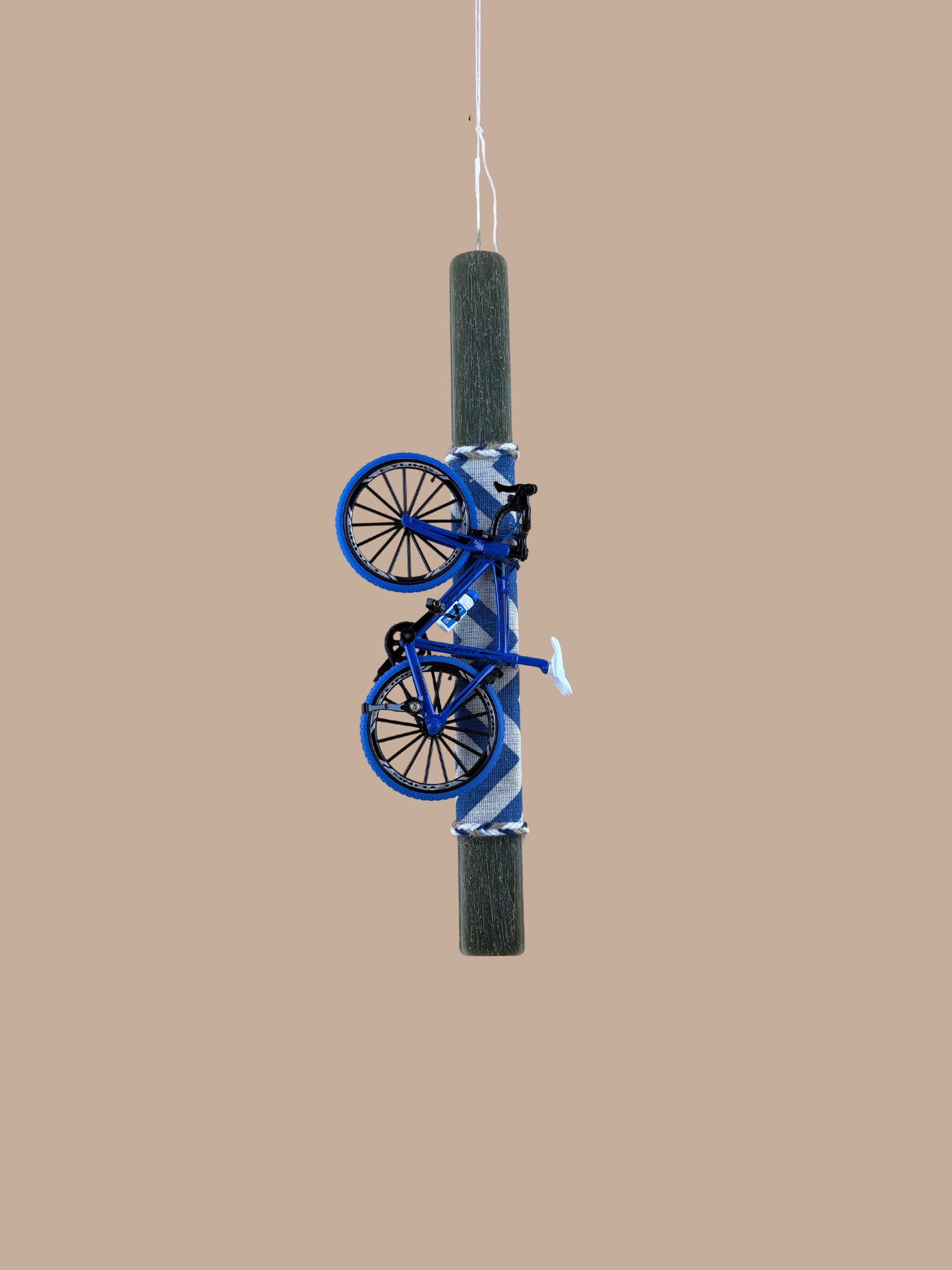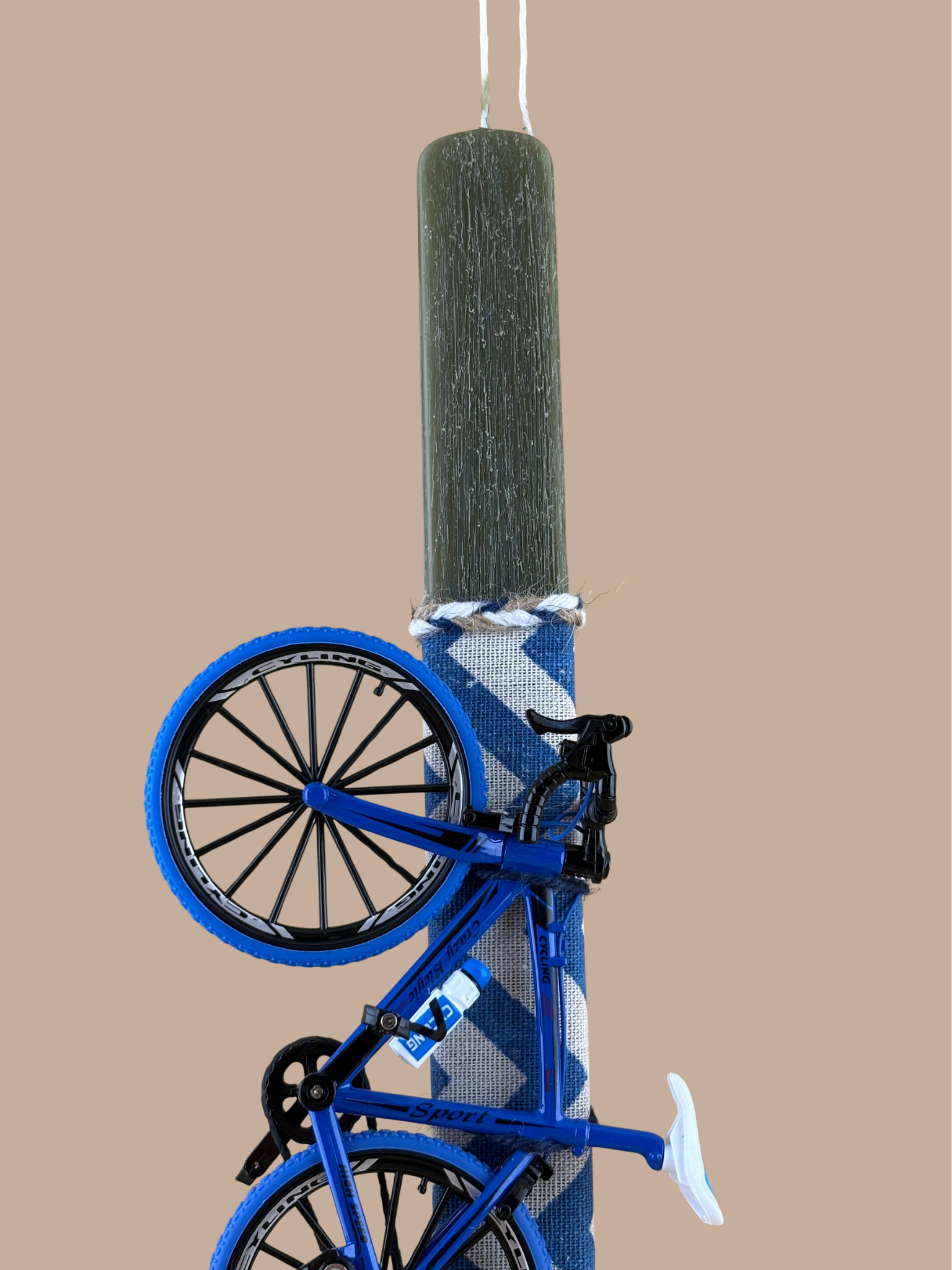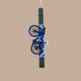 Για τους μικρούς και μεγάλους λάτρεις της ποδηλασίας, η λαμπάδα “Blue Speed” συνδυάζει την παράδοση με το μοντέρνο design. Το χειροποίητο πλακέ κερί με την ιδιαίτερη “ξυστή” υφή σε βαθύ λαδί χρώμα, φιλοξενεί μια ρεαλιστική μινιατούρα μπλε ποδηλάτου δρόμου με απίστευτη λεπτομέρεια. Η διακόσμηση ολοκληρώνεται με υφασμάτινη κορδέλα σε navy chevron μοτίβο, δημιουργώντας ένα κομψό και ταυτόχρονα δυναμικό δώρο για το βαφτιστήρι σας.