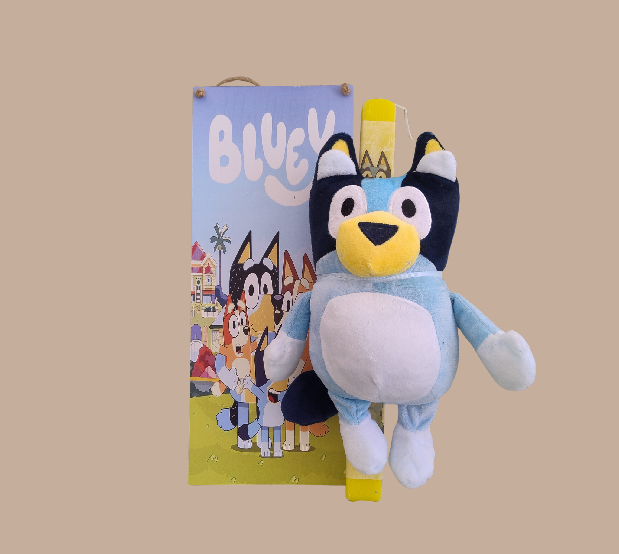 • Η Λαμπάδα: Πρόκειται για μια αρωματική λαμπάδα ύψους 36 εκ. με την ιδιαίτερη “ξυστή” υφή που χαρακτηρίζει τις δημιουργίες μας. Είναι διακοσμημένη με την τεχνική του ντεκουπάζ, απεικονίζοντας την Bluey σε ένα υπέροχο ανοιξιάτικο φόντο.