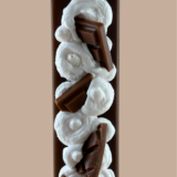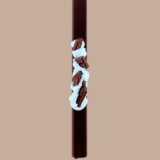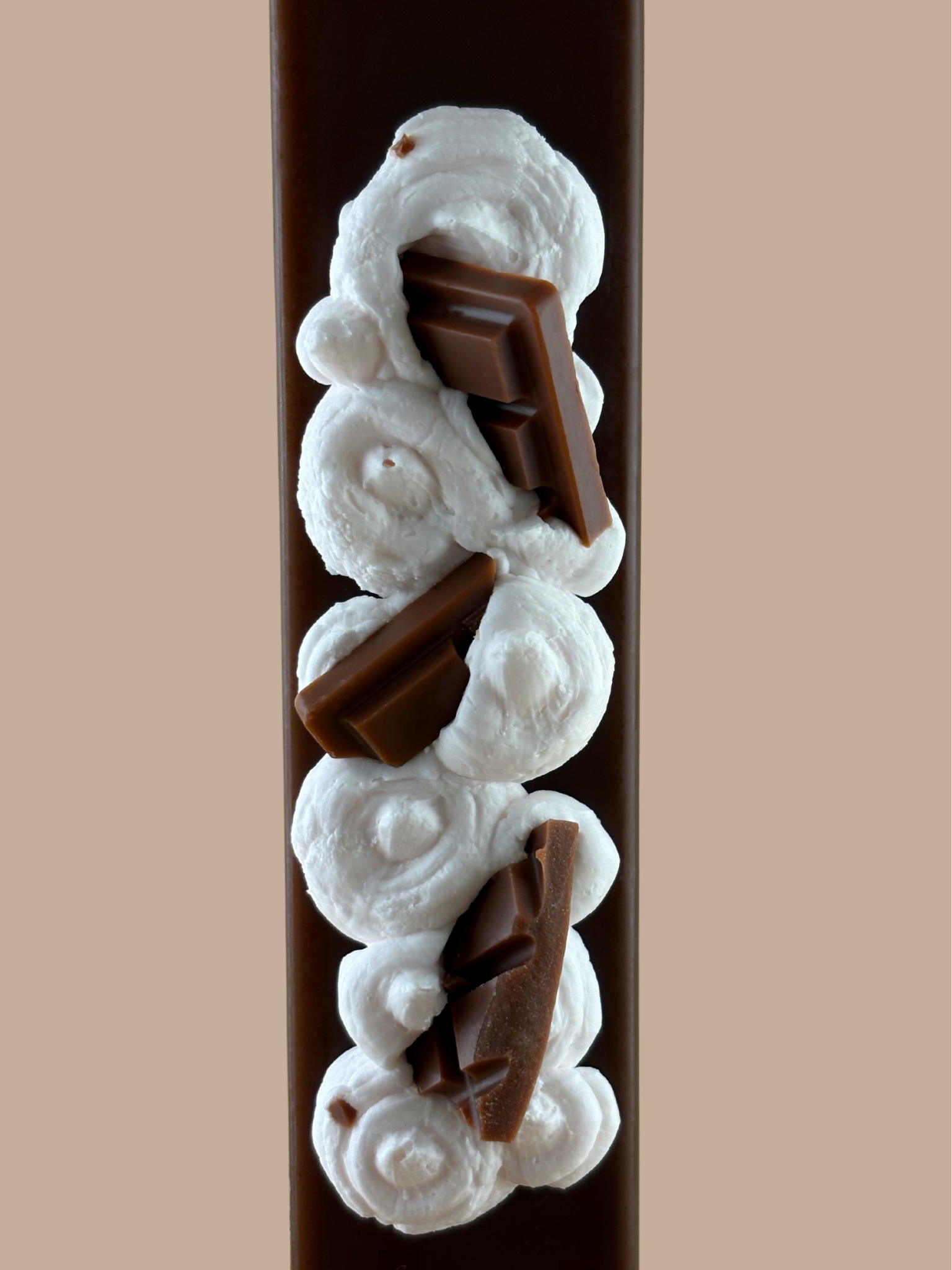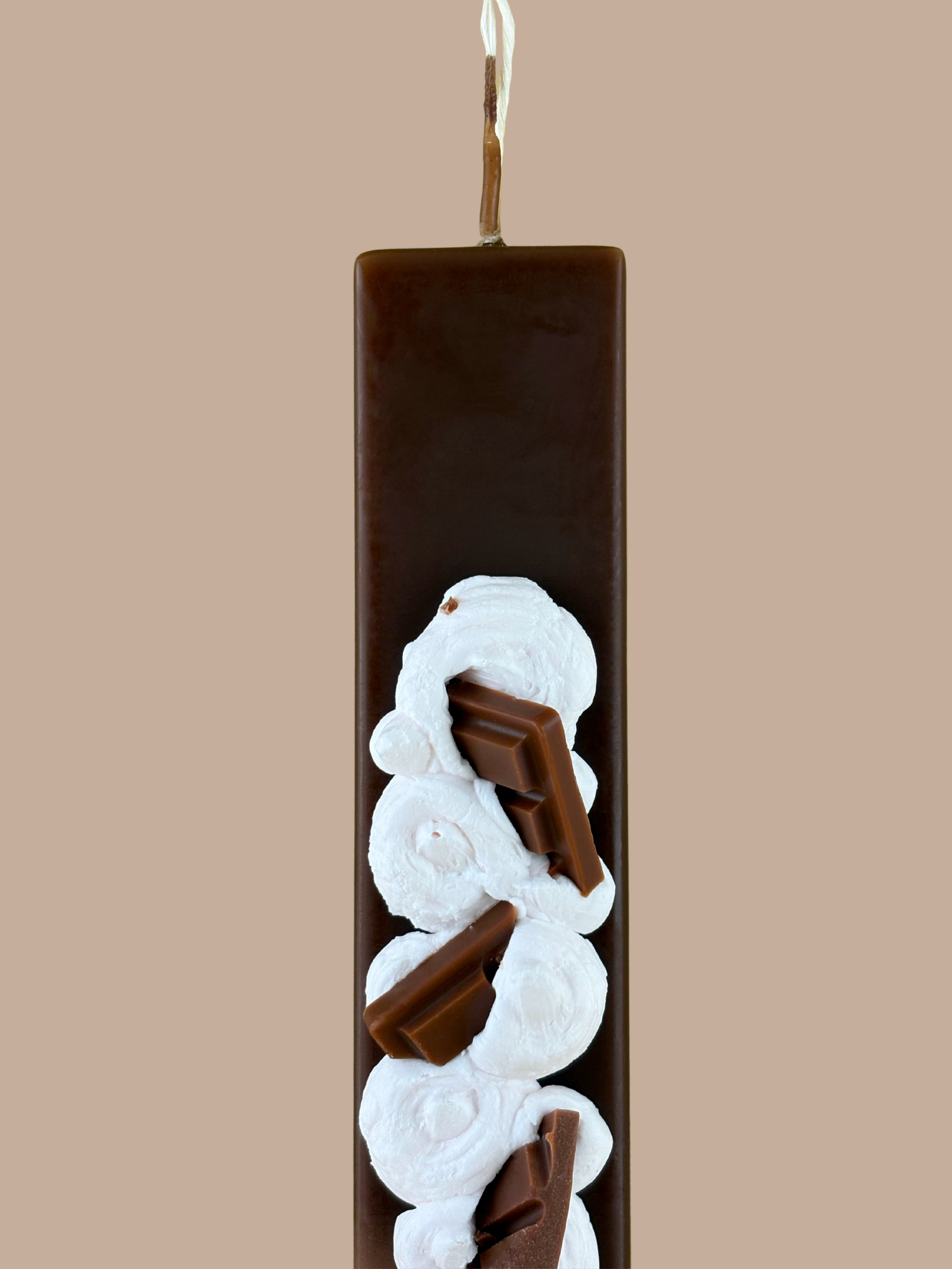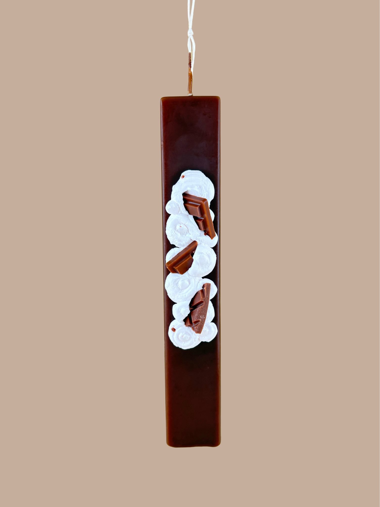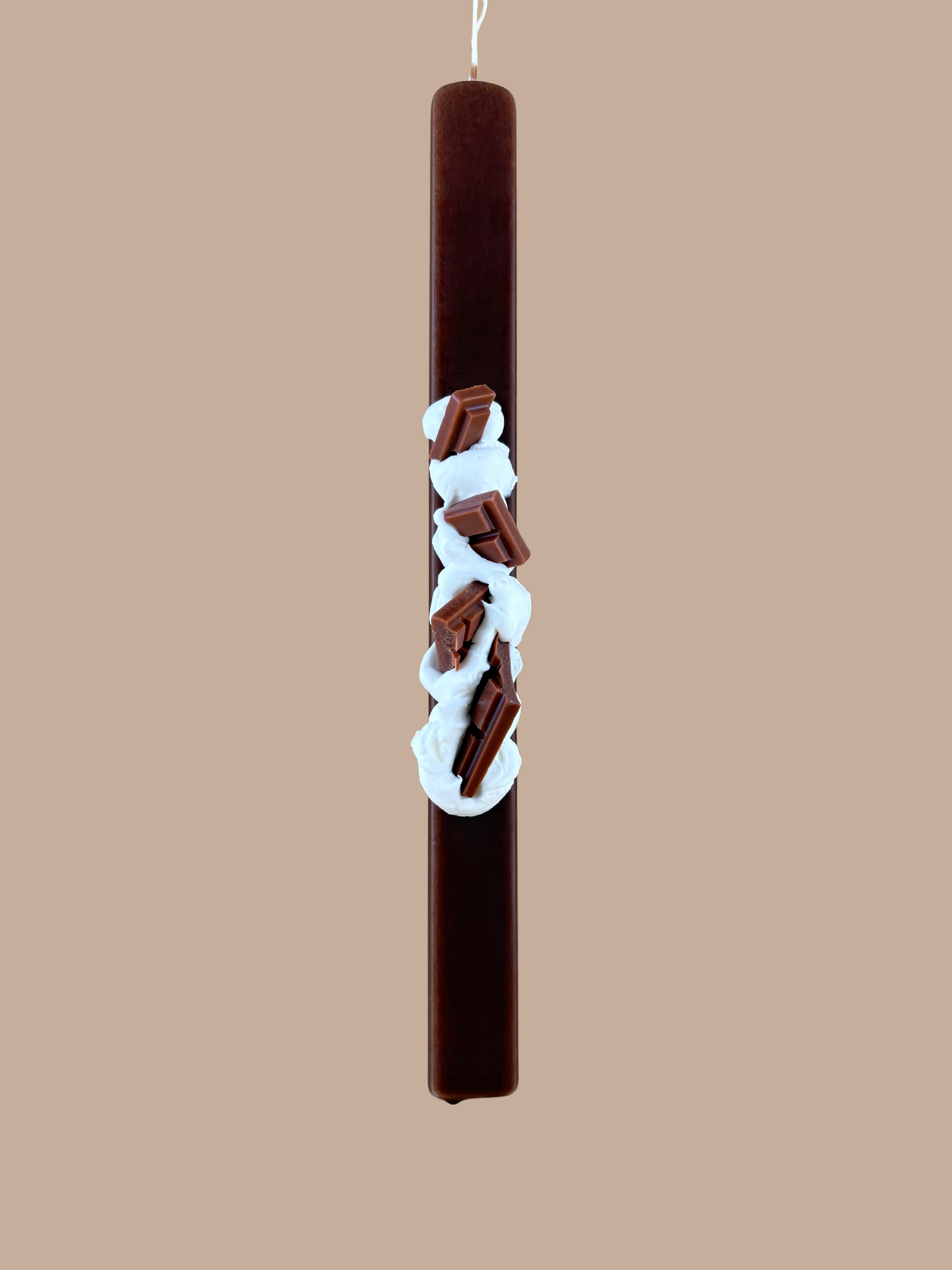 Μια λαμπάδα που μοιάζει με γλυκό πειρασμό! Αυτή η χειροποίητη πασχαλινή λαμπάδα σε βαθύ σοκολατί χρώμα, είναι διακοσμημένη με ρεαλιστικές ροζέτες “σαντιγί” και κομμάτια “σοκολάτας”, όλα φιλοτεχνημένα εξ ολοκλήρου από κερί.