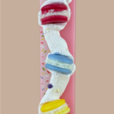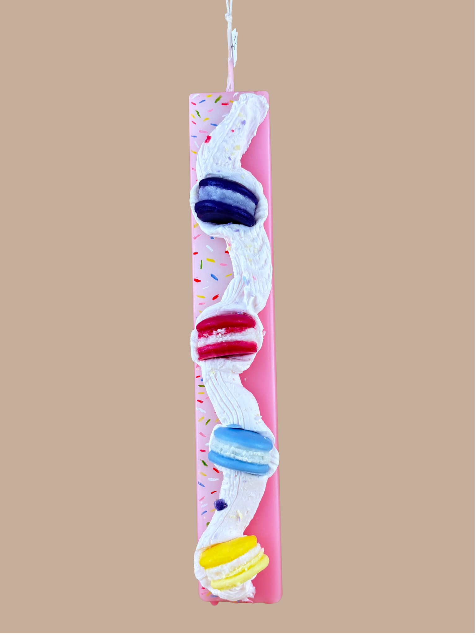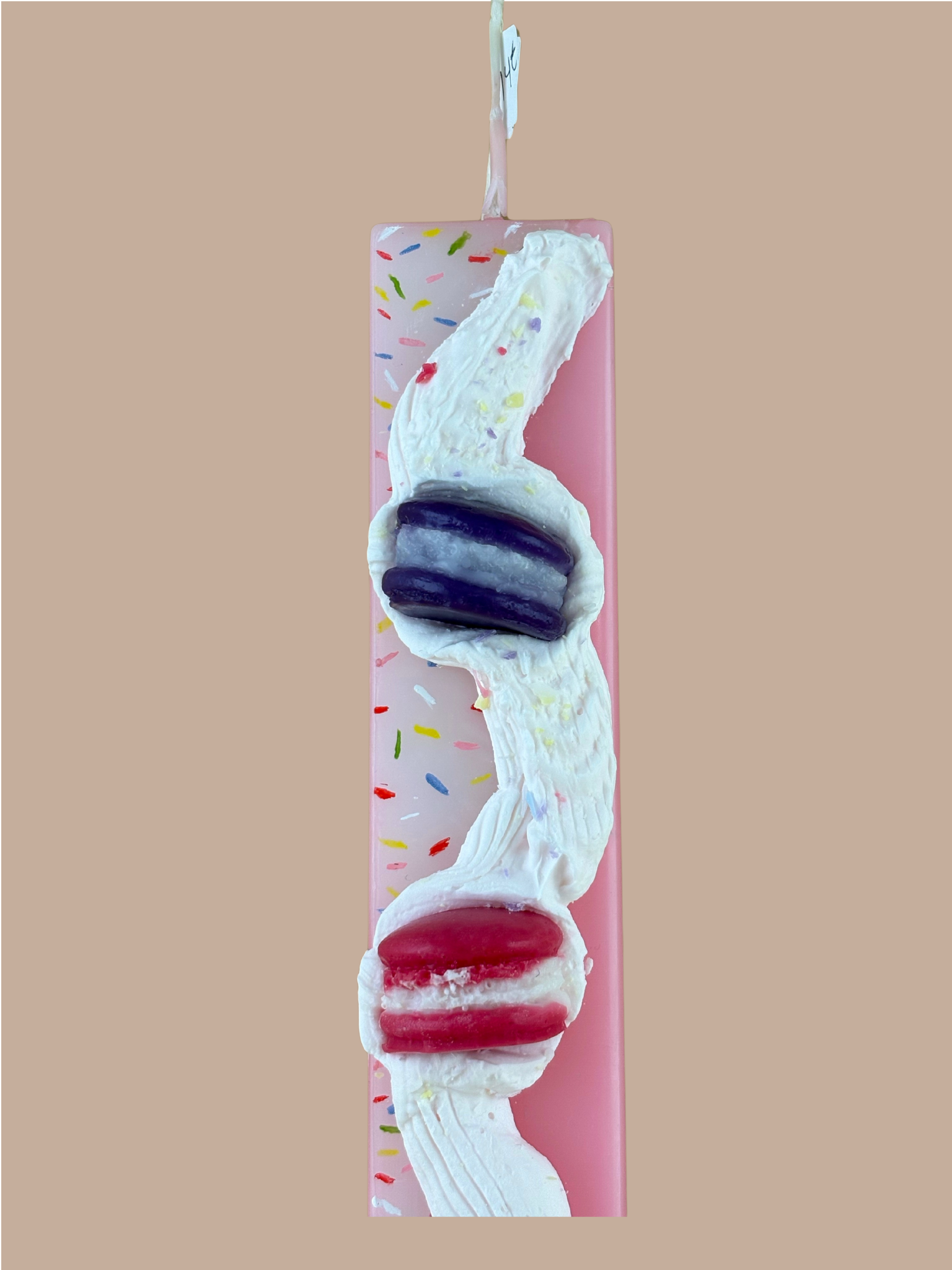• 3D Λεπτομέρειες από Κερί: Το highlight της λαμπάδας είναι το “κύμα” από λευκή σαντιγί (φτιαγμένη από ειδικό μαλακό κερί), πάνω στην οποία “φωλιάζουν” τέσσερα χειροποίητα macarons σε έντονες αποχρώσεις: βαθύ μωβ, φούξια, γαλάζιο και κίτρινο.