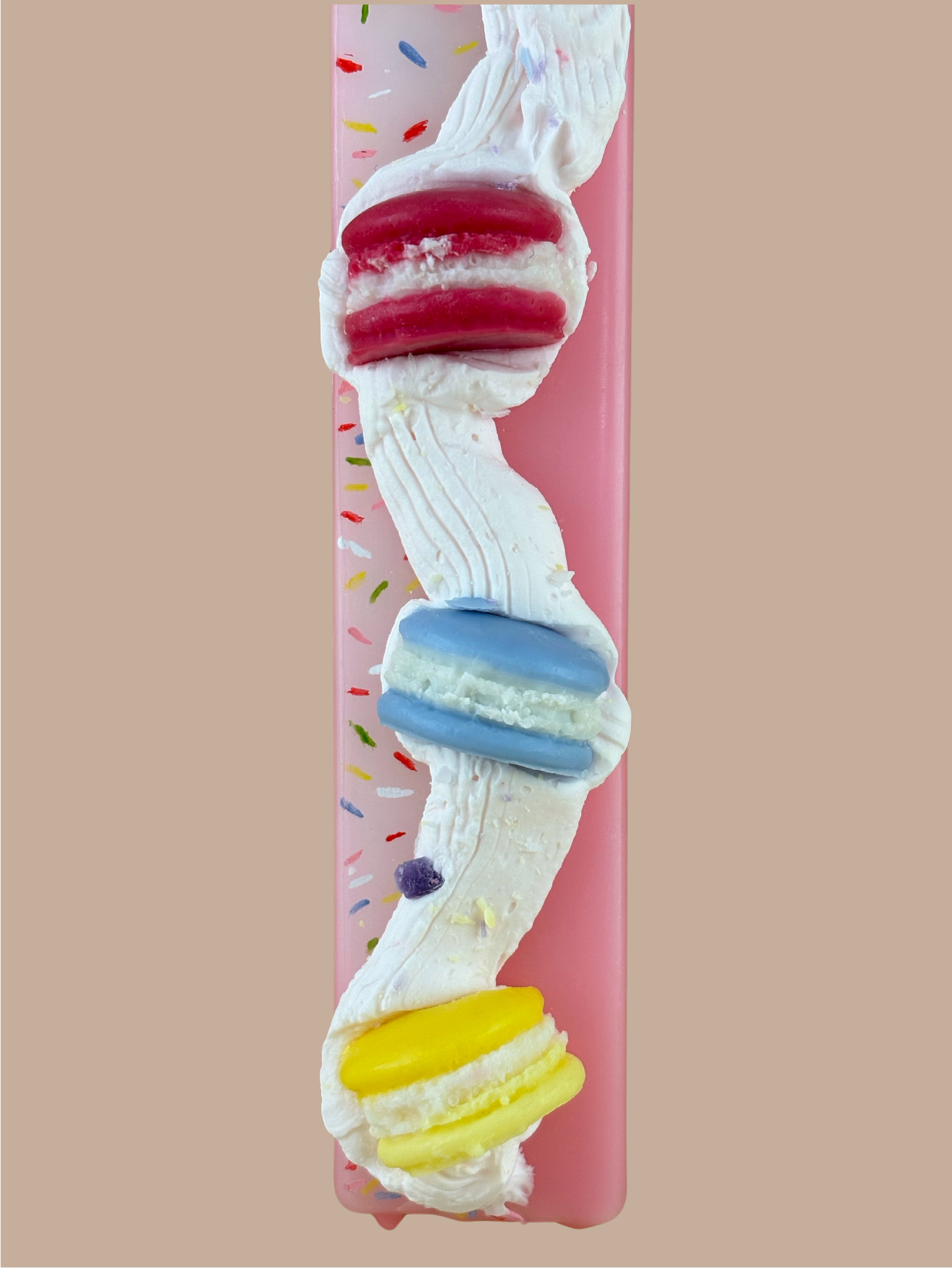 • Διακόσμηση: 100% χειροποίητα στοιχεία από κερί (macarons & frosting).
