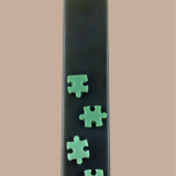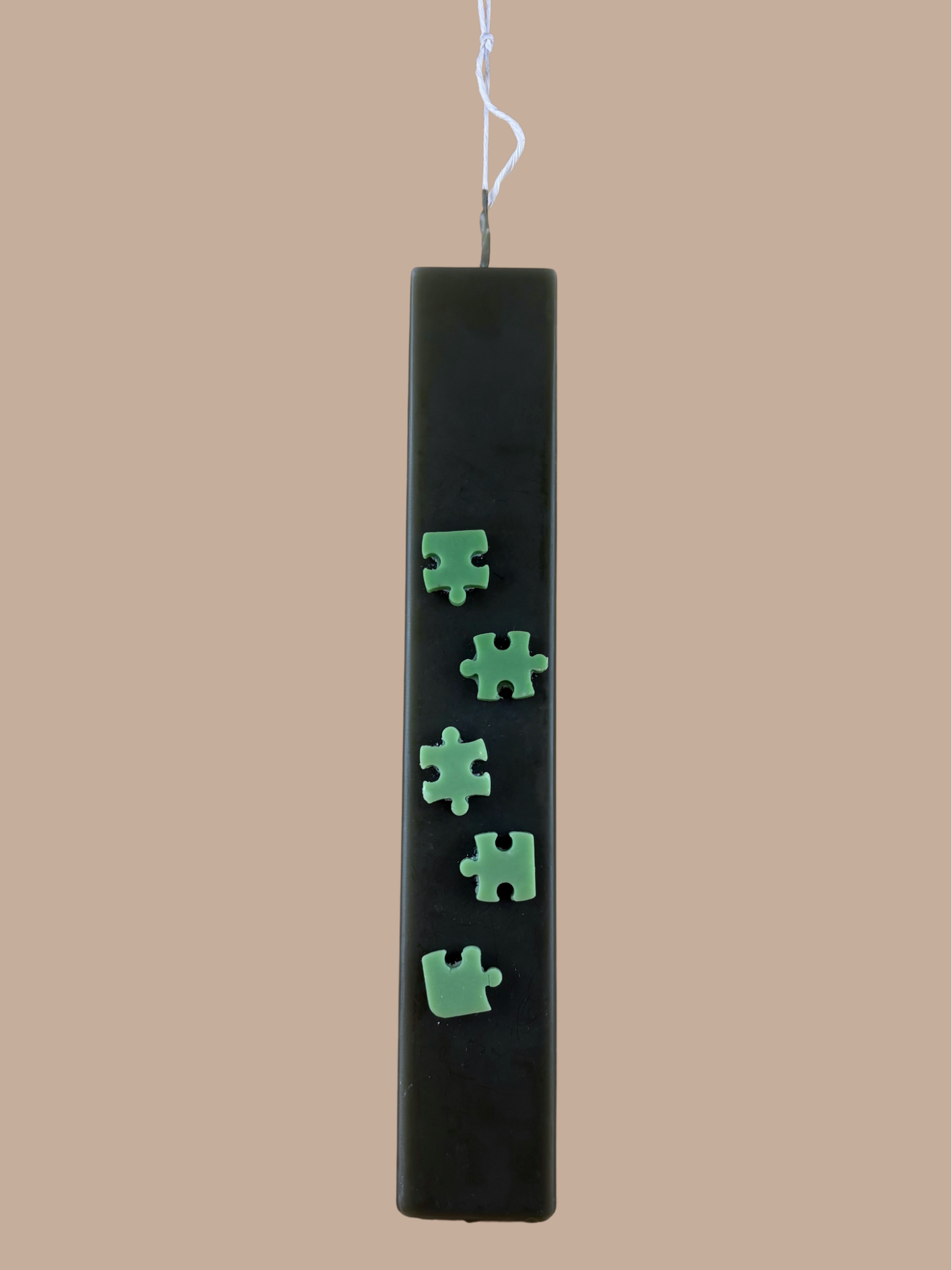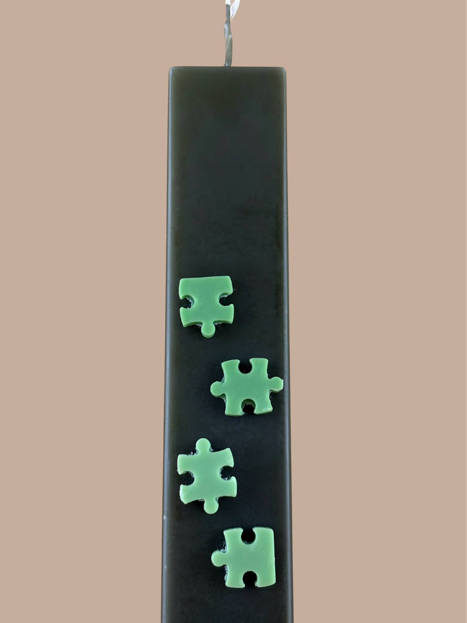 Το design είναι μινιμαλιστικό και ισορροπημένο. Τα πράσινα κομματάκια του παζλ δημιουργούν ένα ενδιαφέρον ‘παιχνίδι’ υφών και χρωμάτων πάνω στη λεία, σκούρα επιφάνεια του κεριού, δίνοντας μια αίσθηση βάθους. Ένα ιδανικό δώρο για όσους εκτιμούν τις χειροποίητες δημιουργίες με άποψη και στυλ.