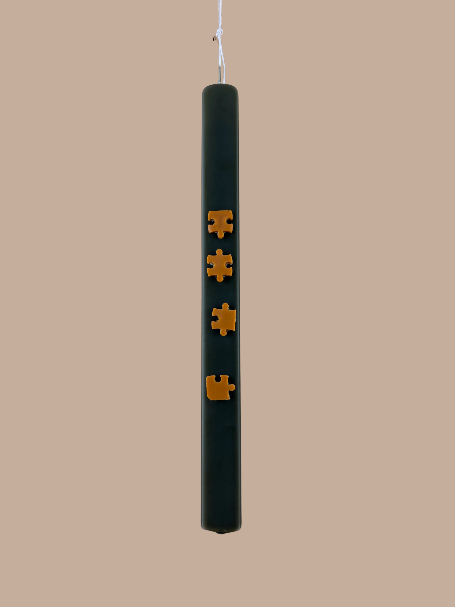 Μια σύγχρονη και εκλεπτυσμένη πρόταση για το φετινό Πάσχα. Αυτή η χειροποίητη πασχαλινή λαμπάδα είναι φτιαγμένη από κερί σε μια κομψή σκούρα λαδί απόχρωση και διακοσμημένη με μια σειρά από κέρινα κομμάτια παζλ σε ζωηρό πράσινο χρώμα.