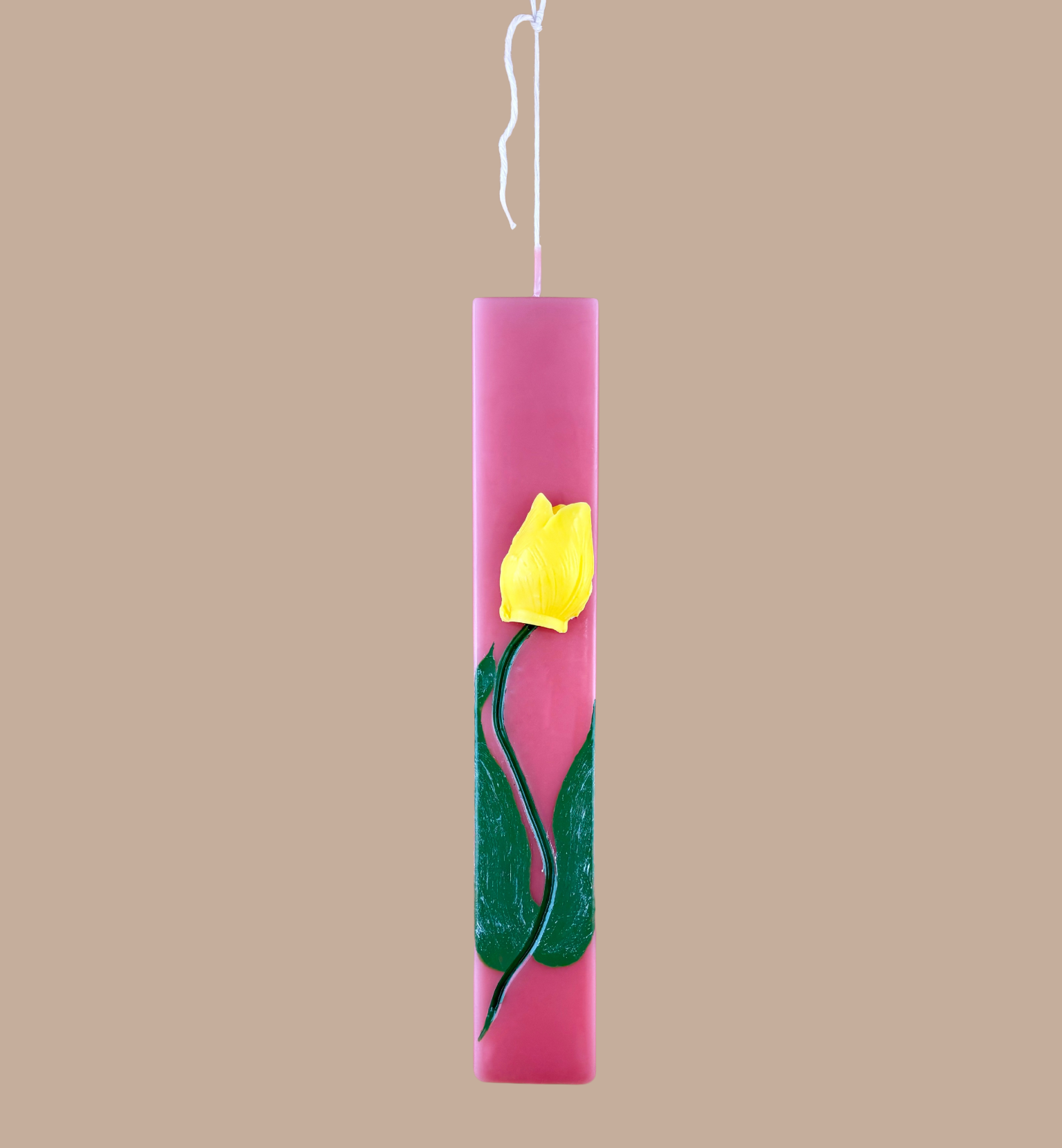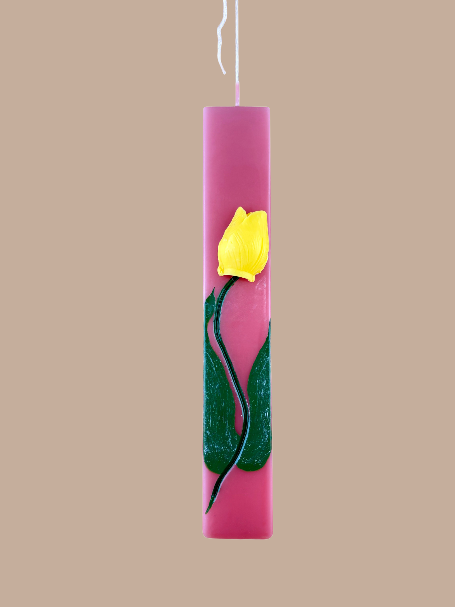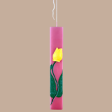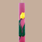 Μια λαμπάδα που μοιάζει με μικρό έργο τέχνης. Σε απαλή ροζ απόχρωση και μοντέρνο πλακέ σχήμα, αυτή η λαμπάδα ξεχωρίζει για τον μοναδικό της σχεδιασμό: μια χειροποίητη κίτρινη τουλίπα από κερί που προσδίδει 3D αποτέλεσμα, ενώ το κοτσάνι και τα φύλλα της είναι ζωγραφισμένα στο χέρι με προσοχή στη λεπτομέρεια. Ιδανική για όσους αναζητούν κάτι εκλεπτυσμένο και ανοιξιάτικο για το βράδυ της Ανάστασης.