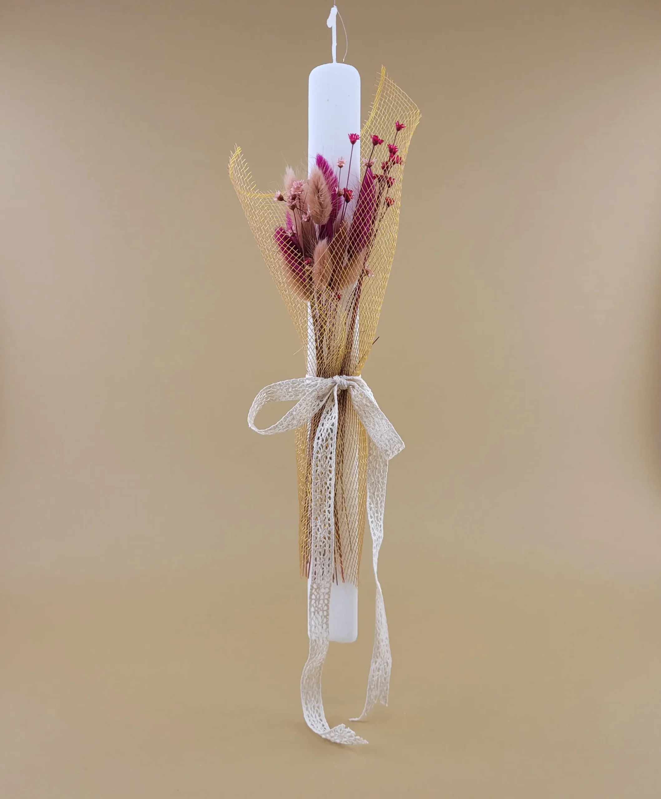 • Η Διακόσμηση: Το κεντρικό στοιχείο είναι ένα πανέμορφο μπουκέτο από πραγματικά αποξηραμένα λουλούδια, προσεκτικά επιλεγμένα για να διατηρούν το σχήμα και το χρώμα τους.