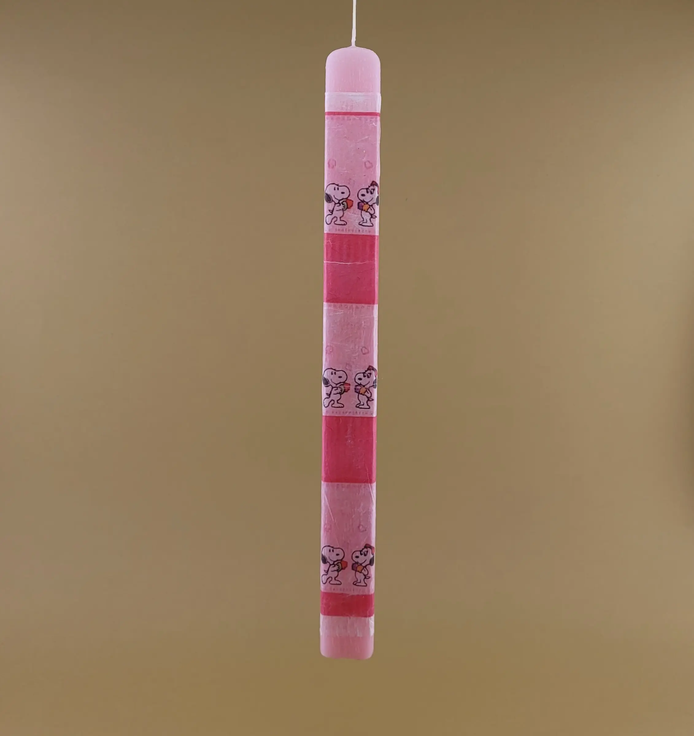 • Η Τεχνική: Η λαμπάδα είναι φιλοτεχνημένη με την παραδοσιακή τεχνική του ντεκουπάζ, ενσωματώνοντας το σχέδιο του Snoopy πάνω στο κερί με τρόπο που μοιάζει με ζωγραφιά.