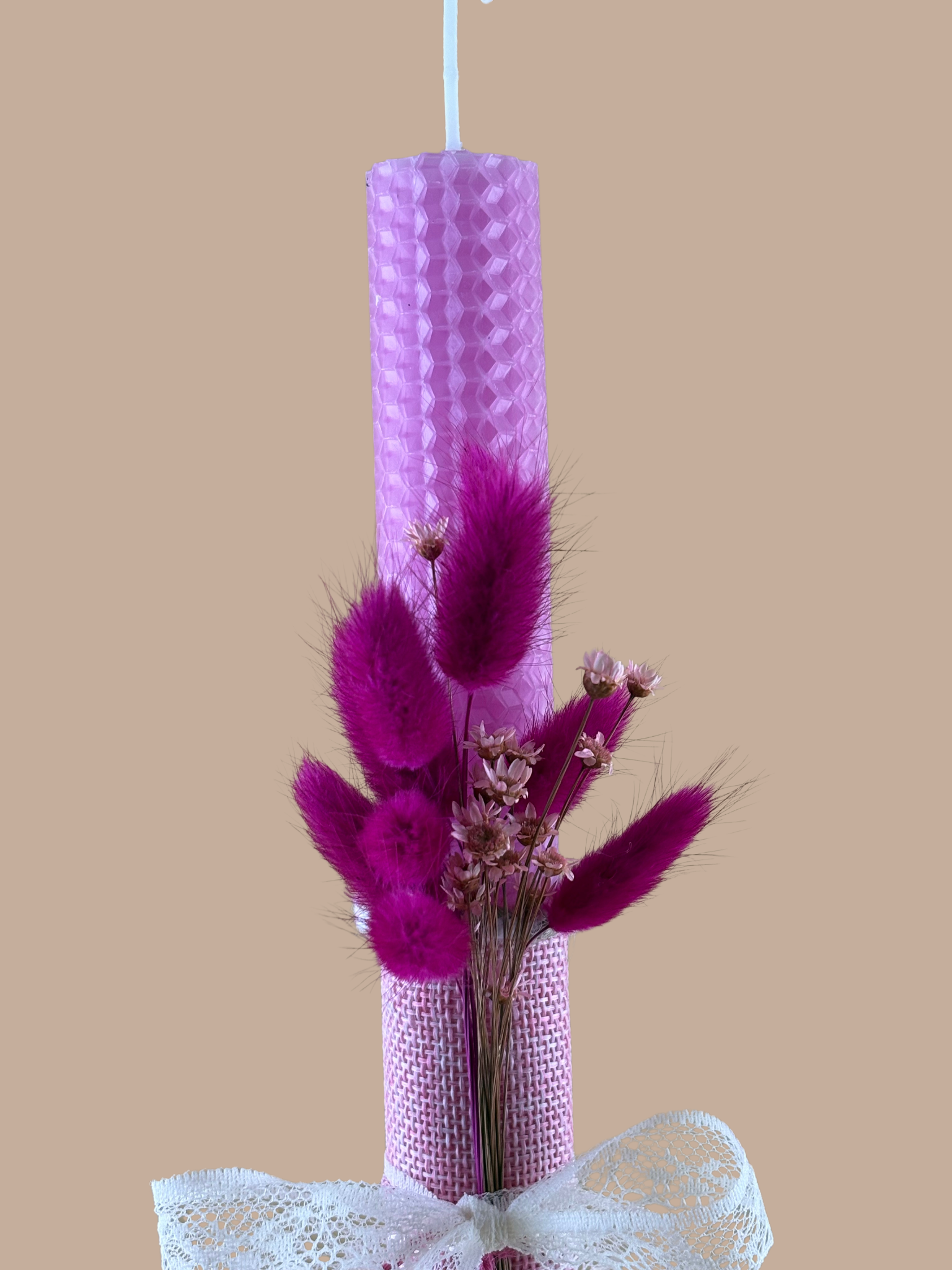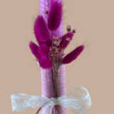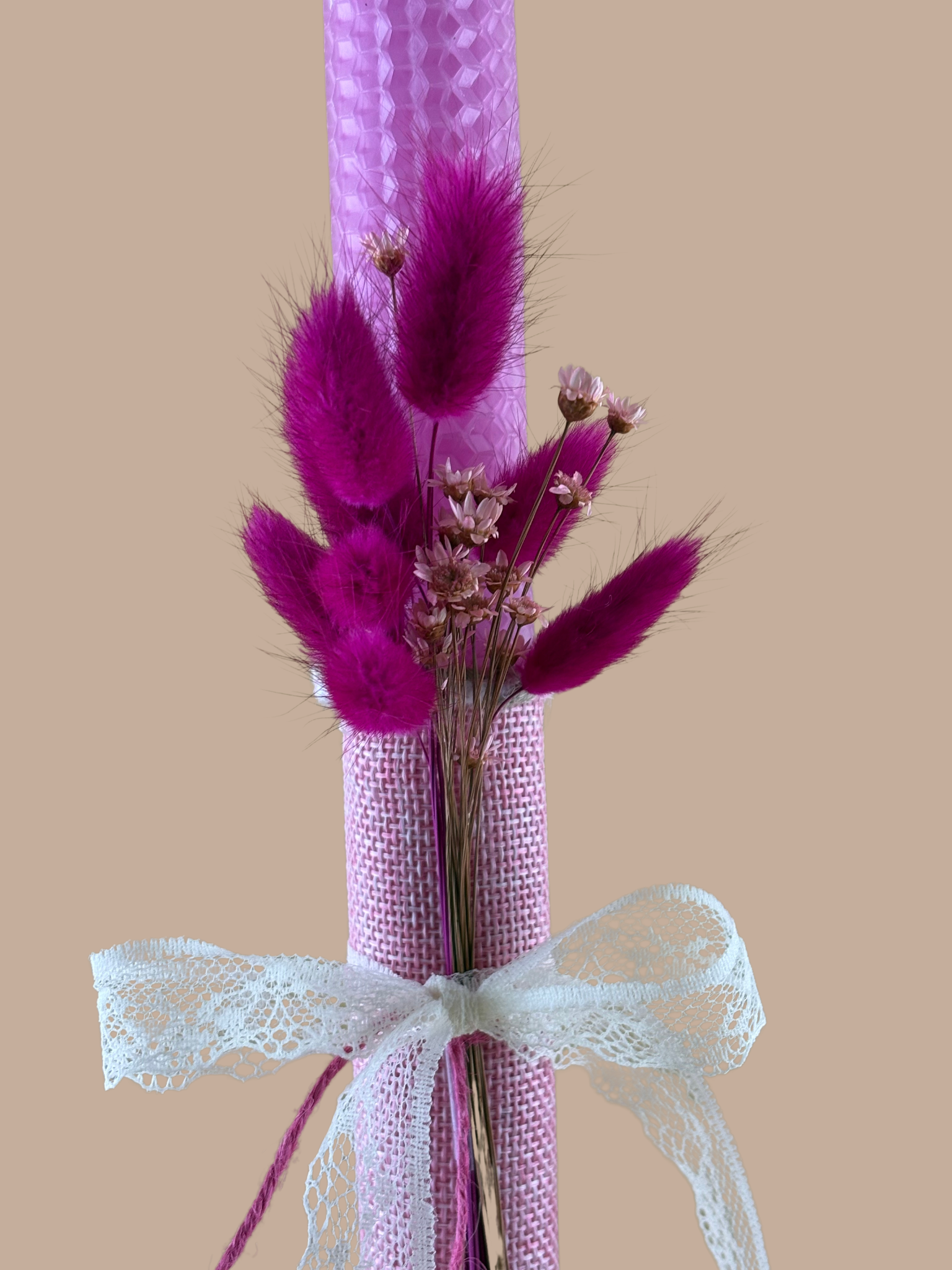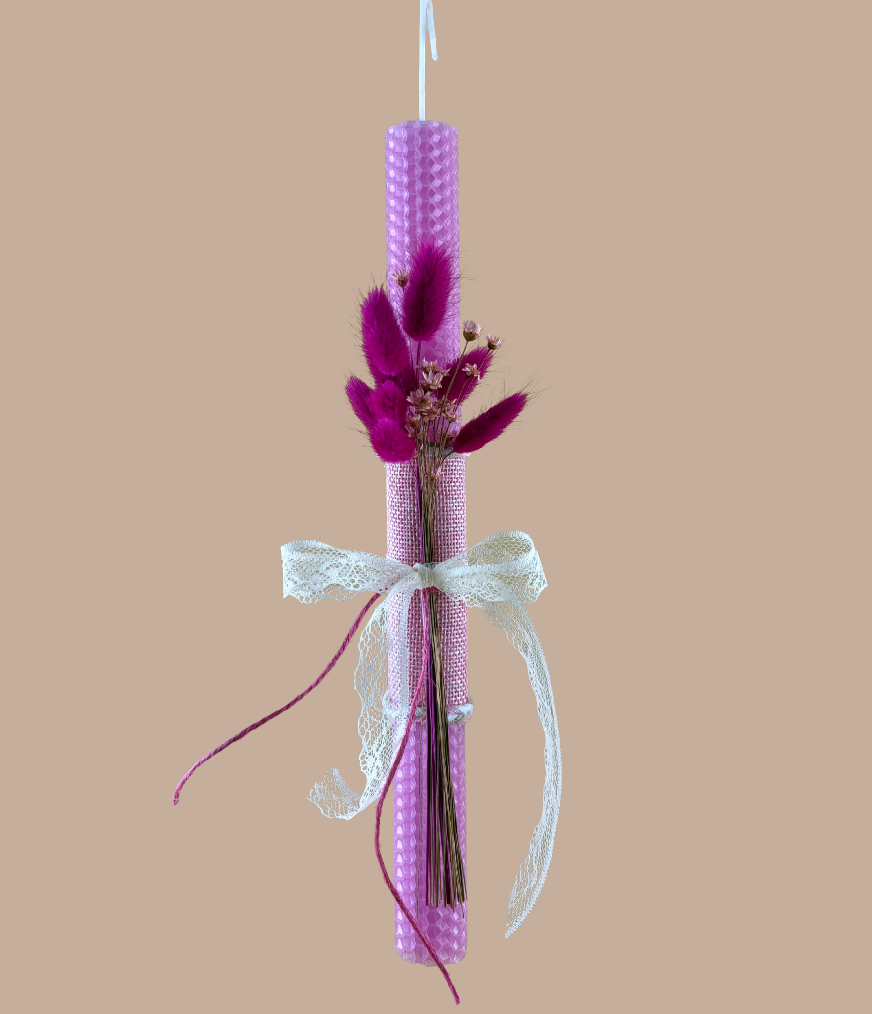 • Ο Στολισμός: Η λαμπάδα είναι διακοσμημένη με μια επιλογή από πραγματικά αποξηραμένα λουλούδια και φύλλα, διατηρώντας τη φυσική τους γοητεία για πάντα.