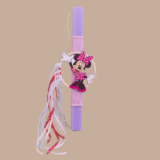 • Η Διακόσμηση: Διαθέτει έναν καλλιτεχνικό ξύλινο κύκλο που πλαισιώνει τη Minnie Mouse, η οποία φοράει το εμβληματικό της πουά φόρεμα. Το σύνολο ολοκληρώνεται με πλούσιες κορδέλες και δαντέλες σε λευκές και λιλά αποχρώσεις.