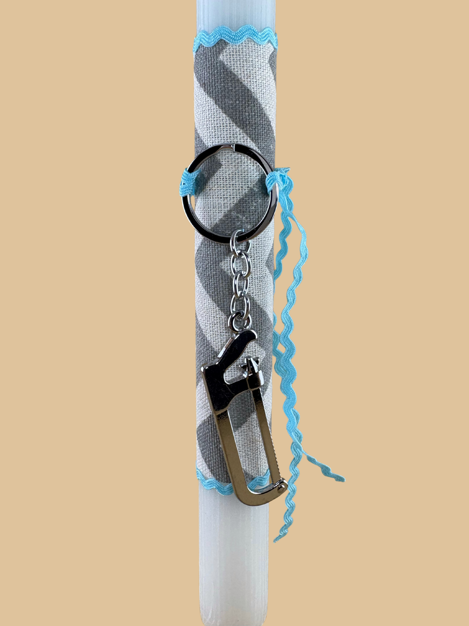 • Στο κέντρο δεσπόζει ένα μεταλλικό μπρελόκ σε σχήμα πριονιού. Είναι μια λεπτομέρεια που ξεχωρίζει και κάνει τη λαμπάδα μοναδική.