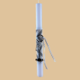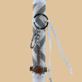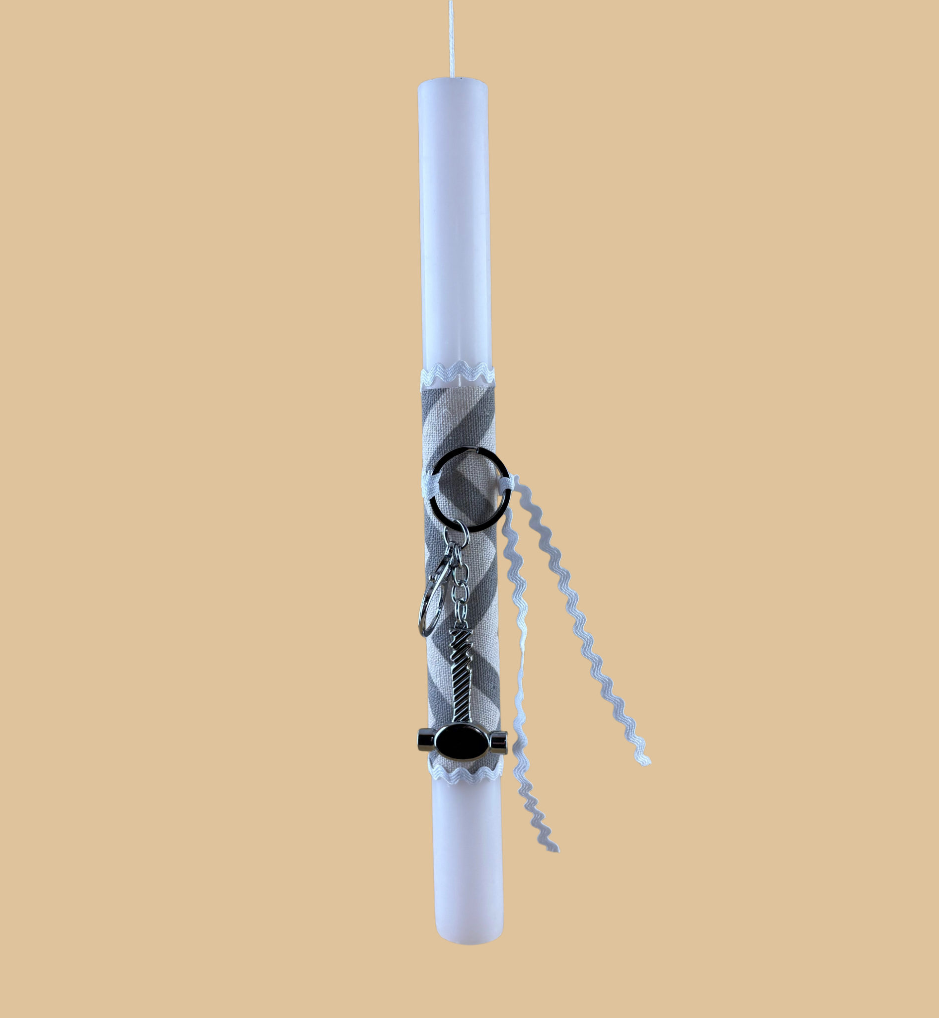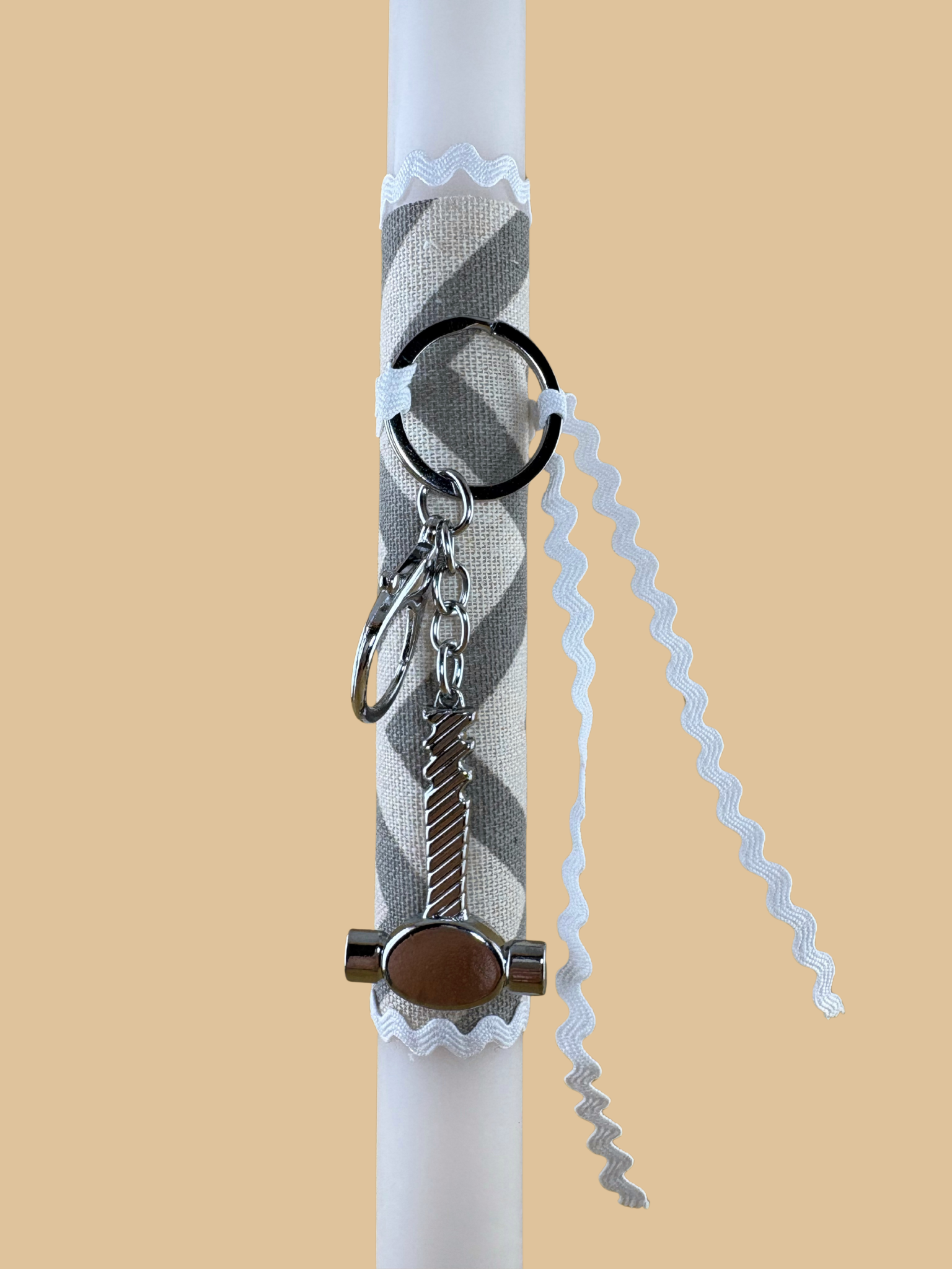 Μια λαμπάδα που συνδυάζει την καθαρότητα του λευκού με τη δύναμη του μετάλλου. Το κερί είναι κλασικό λευκό, με λεία υφή και στρογγυλό σχήμα, προσφέροντας μια σταθερή και κομψή βάση. Είναι διακοσμημένη με γκρι-λευκό ριγέ ύφασμα και λευκά κορδόνια ζικ-ζακ, ενώ το κεντρικό της στοιχείο είναι ένα μεταλλικό μπρελόκ “Σφυρί”, το οποίο αποσπάται για να χρησιμοποιηθεί στα κλειδιά ή στην τσάντα.