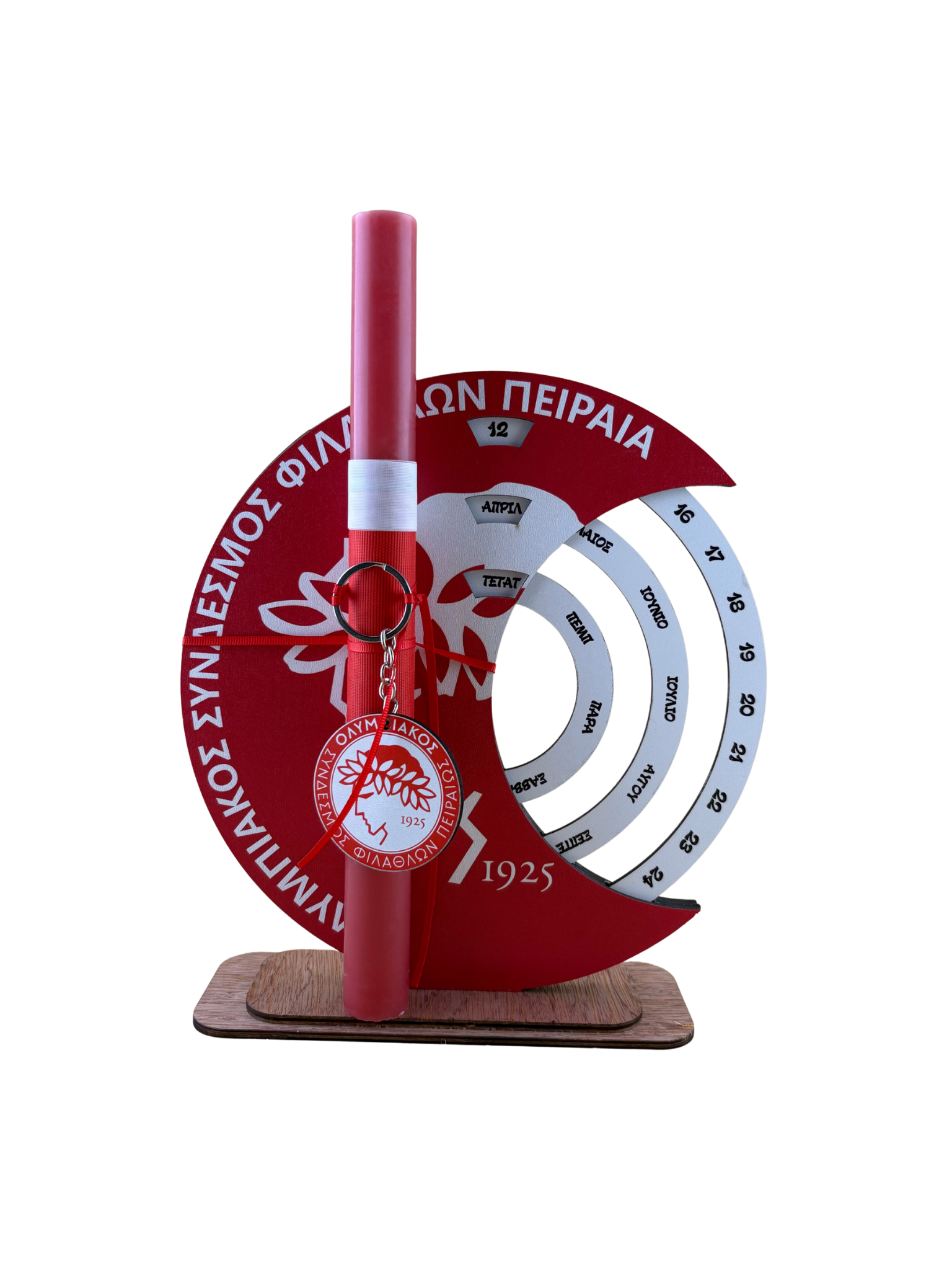 Αυτή η ιδιαίτερη πασχαλινή σύνθεση είναι σχεδιασμένη για τους πιστούς οπαδούς του Ολυμπιακού. Συνδυάζει μια κομψή, χειροποίητη αρωματική λαμπάδα σε βαθύ κόκκινο χρώμα με ένα μοναδικό ξύλινο αξεσουάρ που θα κοσμήσει το γραφείο ή το δωμάτιό σου όλο τον χρόνο.