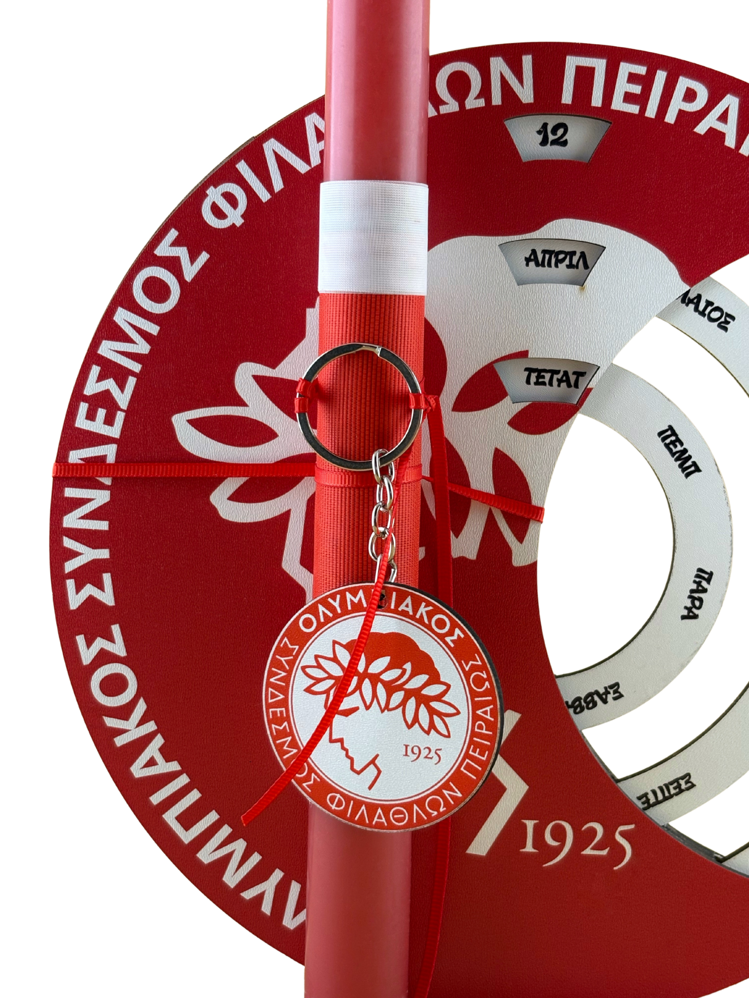 • Χειροποίητη Λαμπάδα: Μοντέρνα, στρογγυλή λαμπάδα σε κόκκινο χρώμα, διακοσμημένη με υφασμάτινες κορδέλες στις αποχρώσεις της ομάδας.
