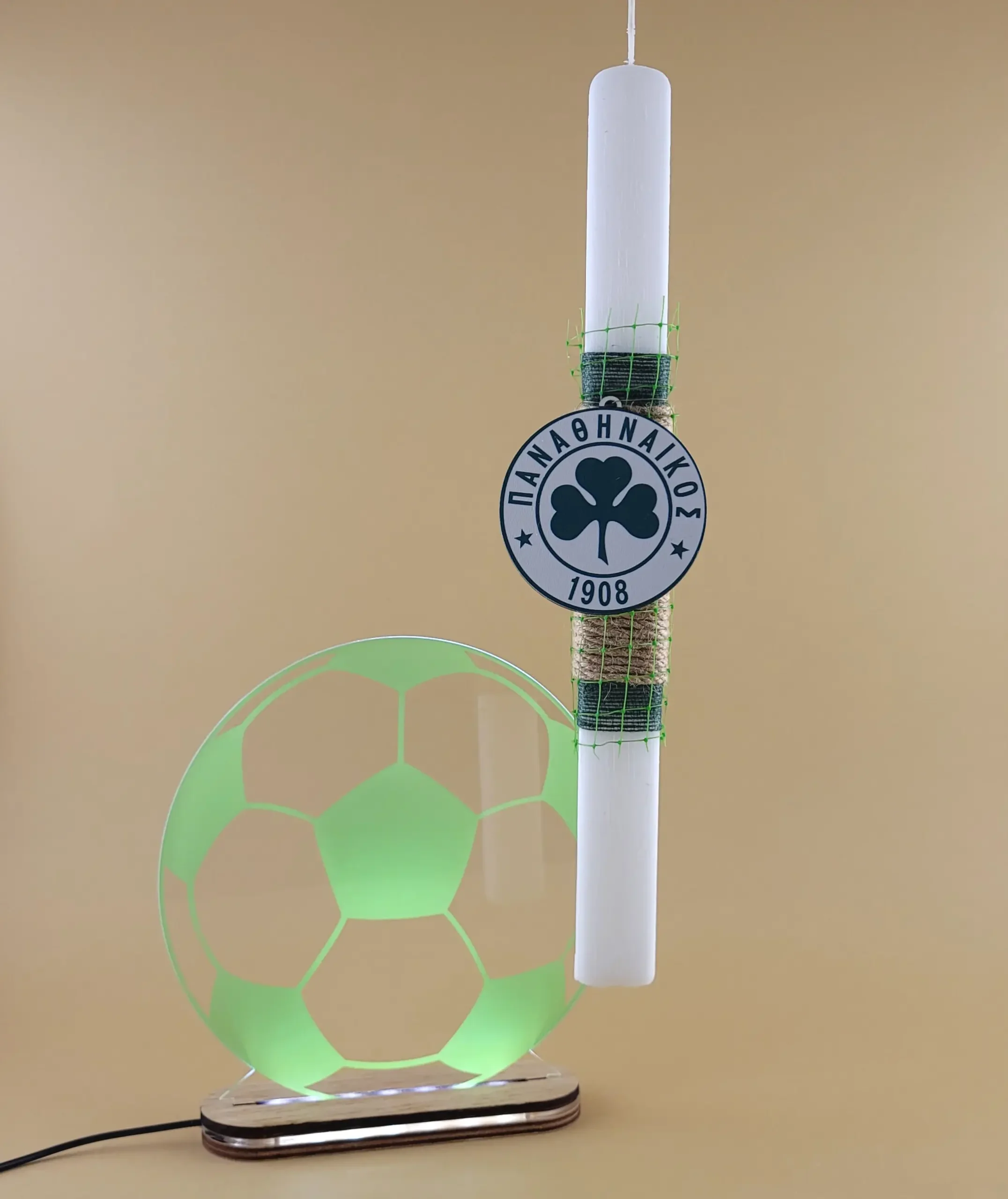 • Η Λαμπάδα: Χειροποίητη αρωματική λαμπάδα σε πράσινες και λευκές αποχρώσεις, στολισμένη με κορδέλες στα χρώματα της ομάδας.