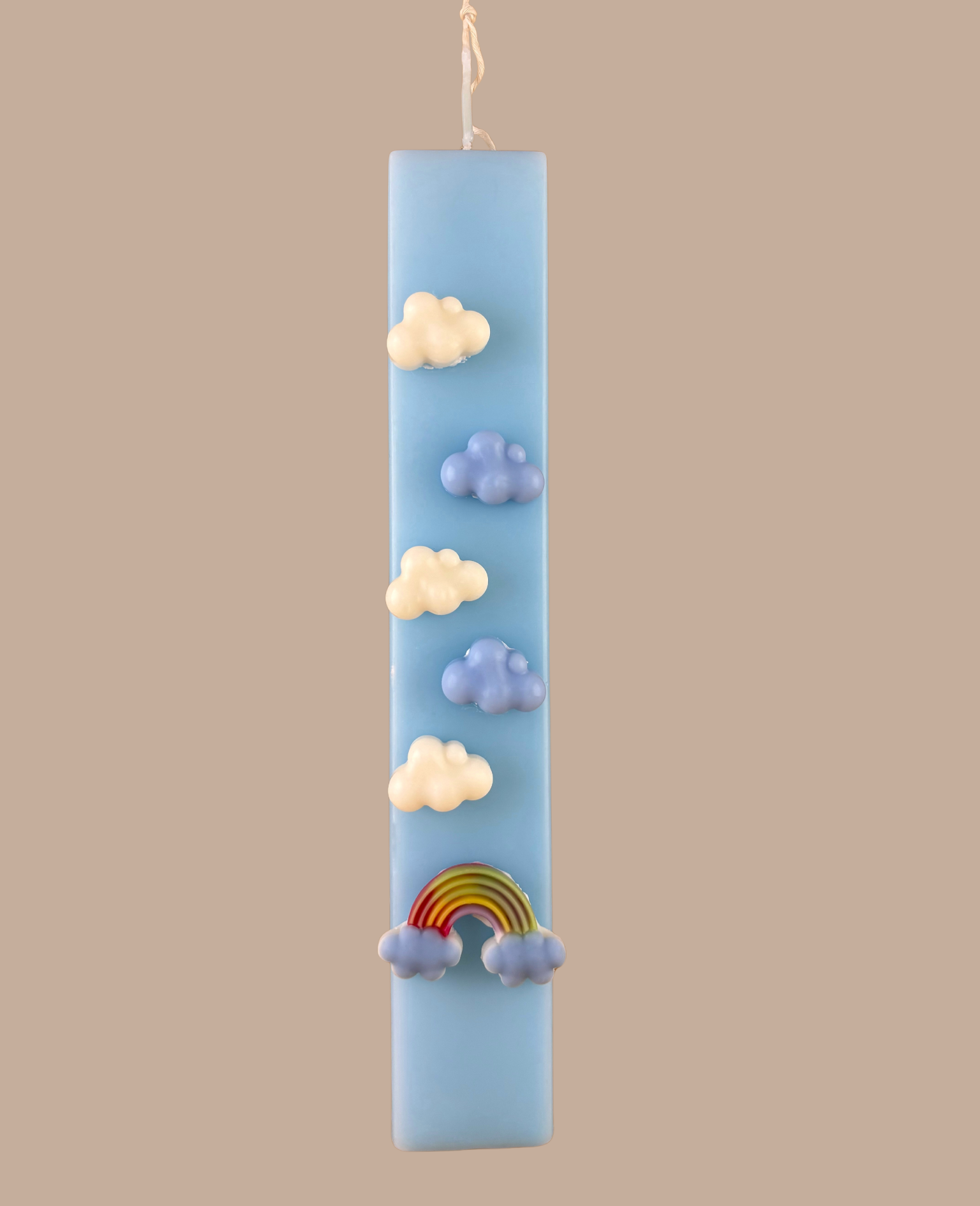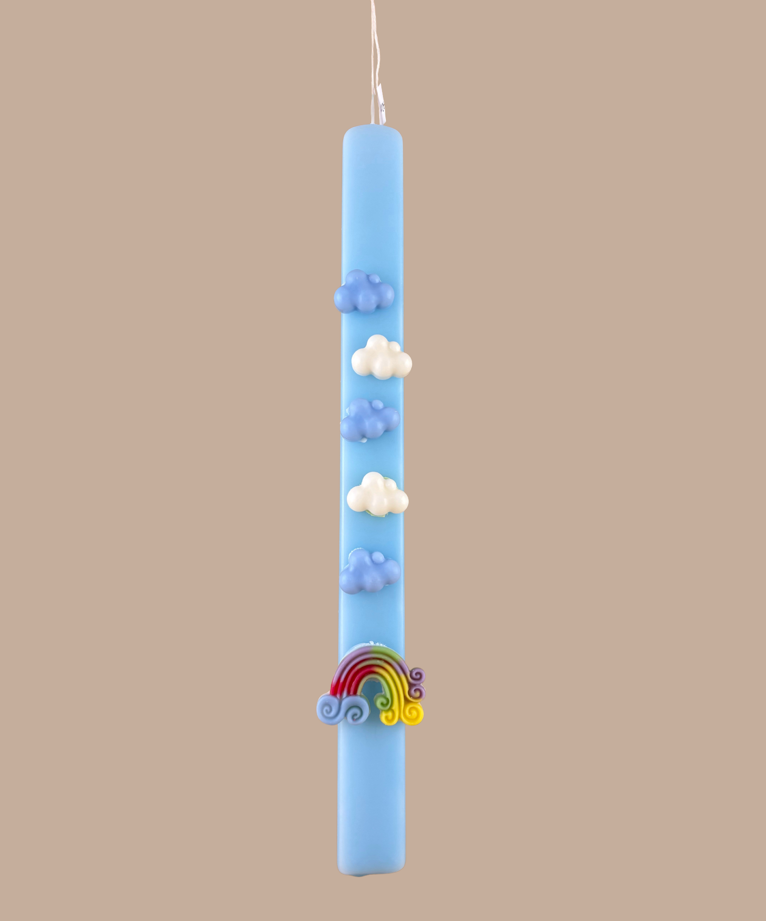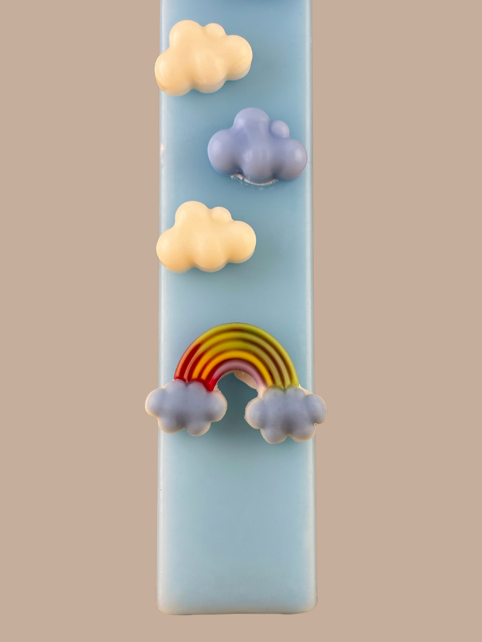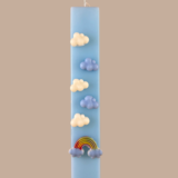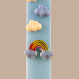 Είναι διακοσμημένη με ανάγλυφα κερένια στοιχεία: τρισδιάστατα λευκά και γαλάζια συννεφάκια που οδηγούν σε ένα πολύχρωμο ουράνιο τόξο στη βάση της. Μια δημιουργία που συνδυάζει την ηρεμία του ουρανού με την αισιοδοξία των χρωμάτων, ιδανική για παιδιά (και μεγάλους!) που αγαπούν τα όνειρα.