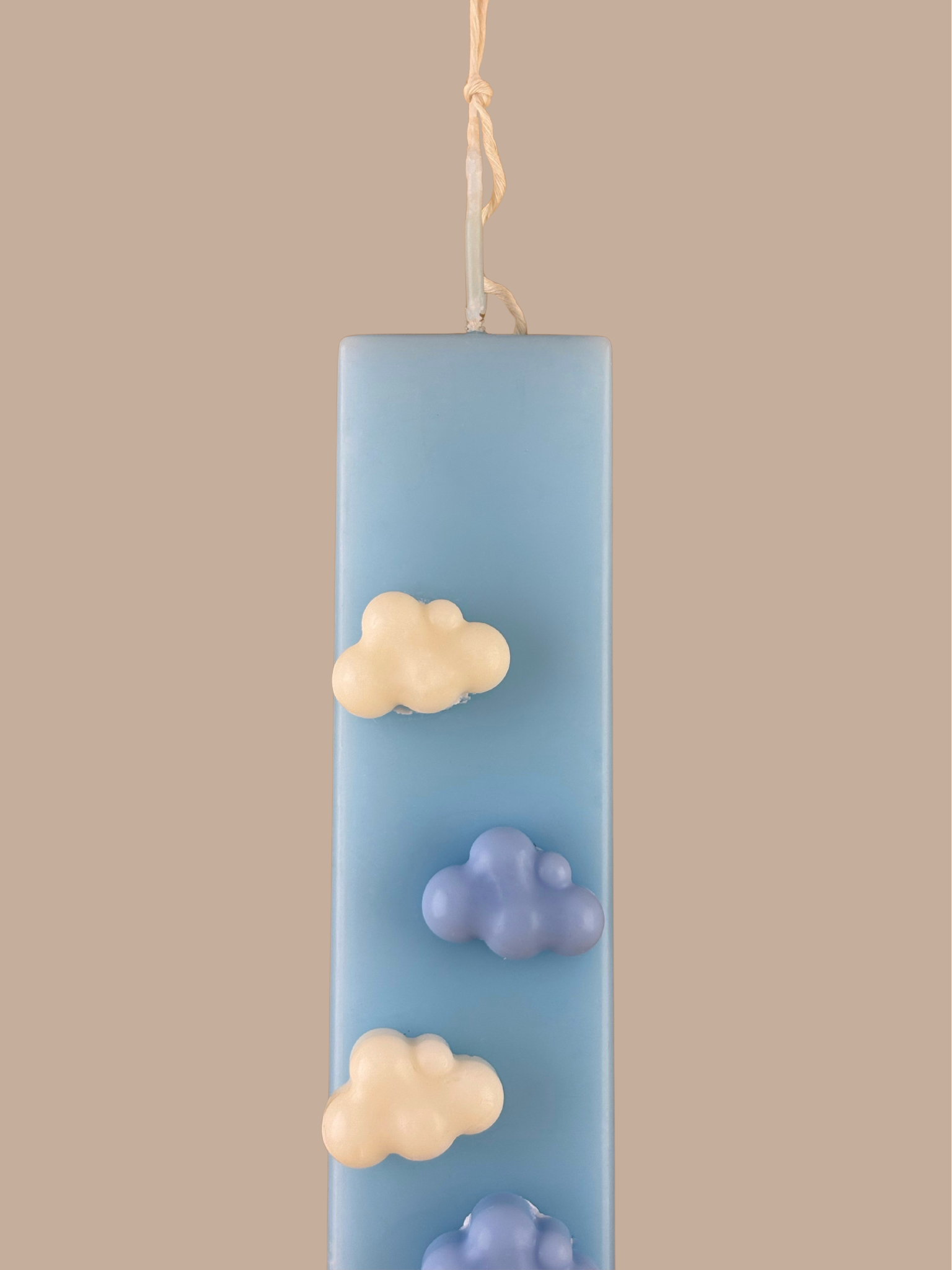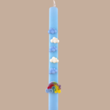 Χαρίστε ένα κομμάτι ουρανού στο βαφτιστήρι σας φέτος το Πάσχα! Αυτή η ιδιαίτερη χειροποίητη λαμπάδα σε απαλό γαλάζιο χρώμα μεταφέρει τη μαγεία μιας ανοιξιάτικης βόλτας πάνω από τα σύννεφα.